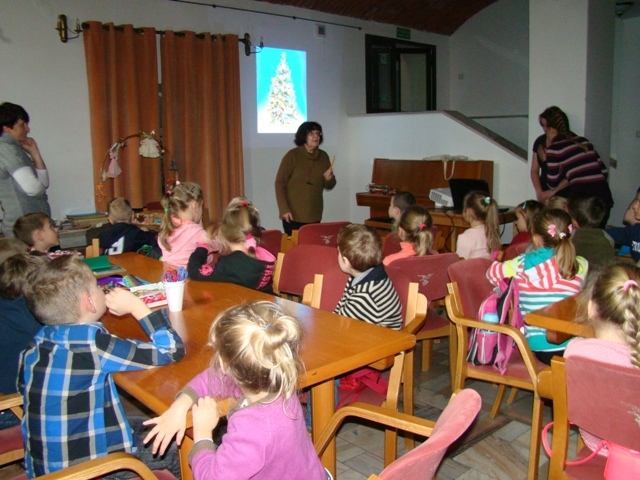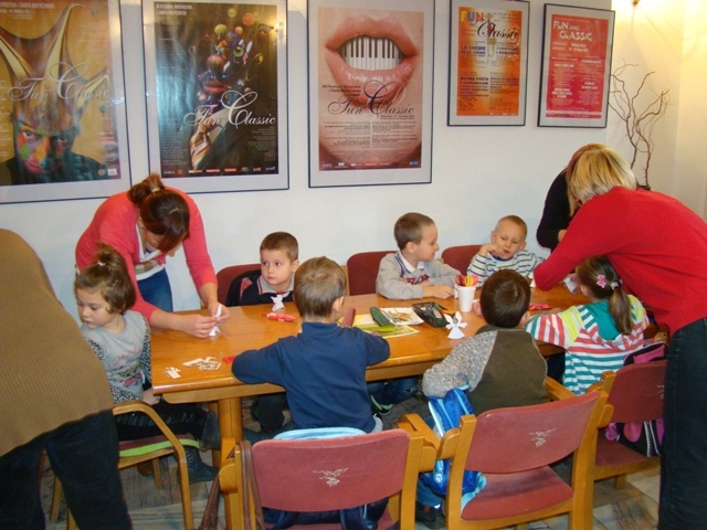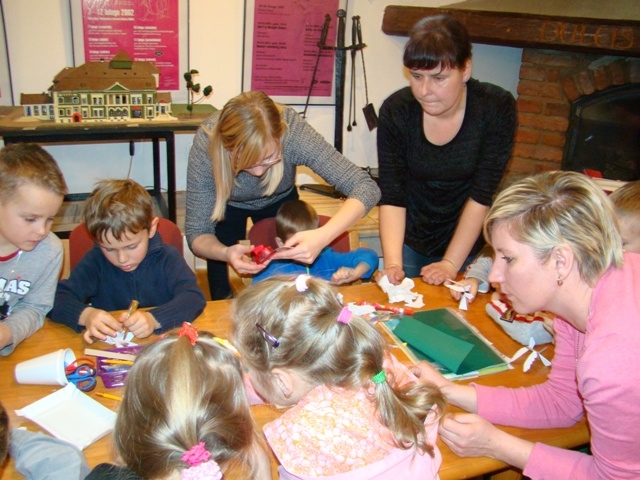 W drugiej części zajęć dzieci wraz z mamusiami wykonały piękne papierowe aniołki, zwierzątka ozdobione łupinkami orzechów oraz kolorowy łańcuch. Nad wykonaniem tych tradycyjnych ozdób choinkowych czuwała pani etnograf. Zajęcia sprawiły wiele radości dzieciom oraz mamusiom. Wykonane przez dzieci ozdoby zawieszono na choince klasowej.