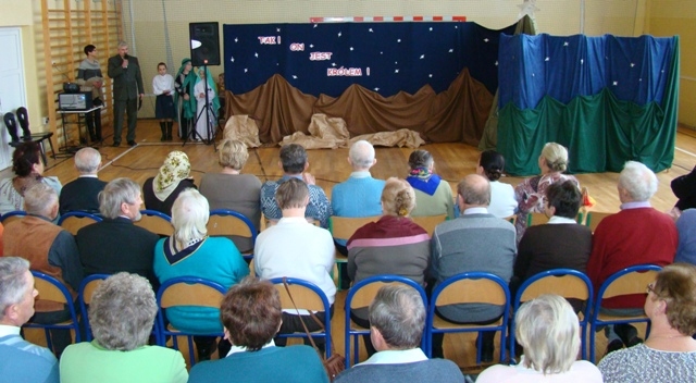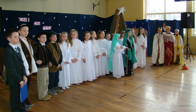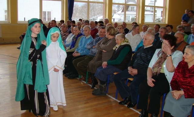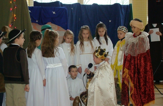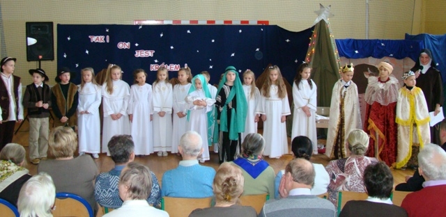 Spotkanie rozpoczęły Jasełka zatytułowane „ Tak. On jest Królem!” przygotowane przez uczniów klas trzecich i szóstych szkoły podstawowej pod opieką siostry zakonnej uczącej w naszej szkole - Anny Kmieć. Po przedstawieniu, odbyła się Wigilia - wspólne łamanie się opłatkiem i poczęstunek oraz śpiewanie kolęd. Kolędowaniu towarzyszyły zespoły wokalne „Amadeo” i „Słoneczka” wraz z nauczycielem akompaniującym - panem Krzysztofem Smydą. Seniorzy mieli okazję spotkać się, porozmawiać, pobyć ze sobą, ale przede wszystkim odczuć, że są ważni, doceniani i honorowani zarówno w środowisku lokalnym jak i poza nim.