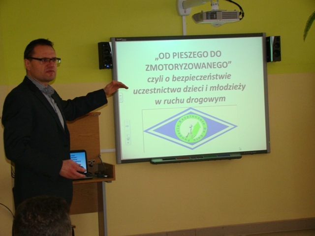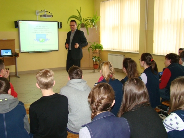 W dniu 11 lutego 2015r. w naszej szkole miało miejsce spotkanie z policjantem dla klas II i III gimnazjum pod hasłem „Od pieszego do zmotoryzowanego czyli o bezpieczeństwie uczestnictwa dzieci i młodzieży w ruchu drogowym”. Młodzież wysłuchała interesującego wykładu o właściwym zachowaniu się na drodze oraz o niebezpieczeństwach związanych z uczestnictwem w ruchu drogowym.