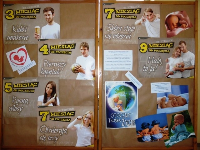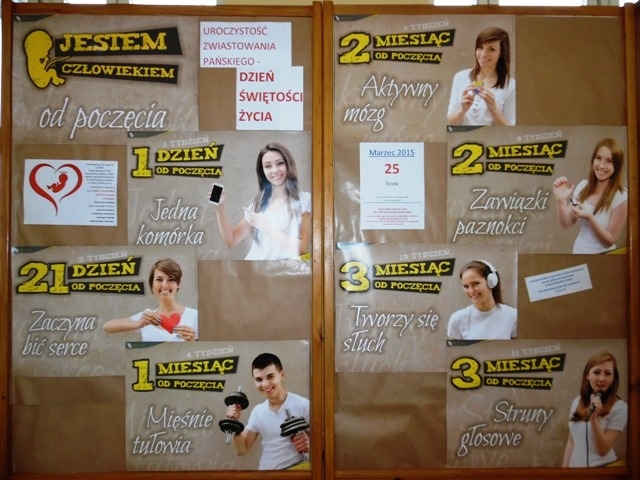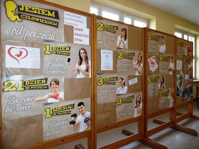Z tej okazji w naszej Szkole została zorganizowana wystawa, przygotowana przez nauczycieli i uczniów. W tym miejscu wyrażamy wdzięczność Pani Annie Radomskiej – doradcy rodziny za udostępnienie profesjonalnych materiałów. Dzięki nim uczniowie – od najmłodszych do najstarszych – mogli zapoznać się z cudowną dynamiką życia człowieka jeszcze w łonie matki. Jednocześnie mogli „dotknąć” tajemnicy Boga, który z miłości stwarza i chroni każde ludzkie życie od jego poczęcia aż do naturalnej śmierci. Przypomina nam o tym On sam w wielu miejscach Biblii przez swoich Proroków: „Czy może kobieta zapomnieć o swym niemowlęciu? Nawet, gdyby ona zapomniała, JA NIE ZAPOMNĘ O TOBIE! Oto wyryłem cię na obu dłoniach!” (Prorok Izajasz – rozdz. 49, wers 15).