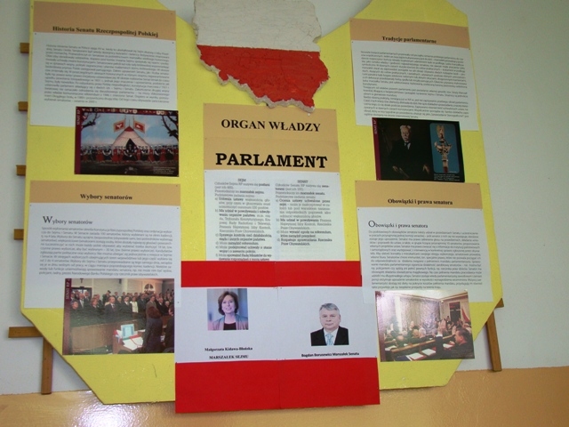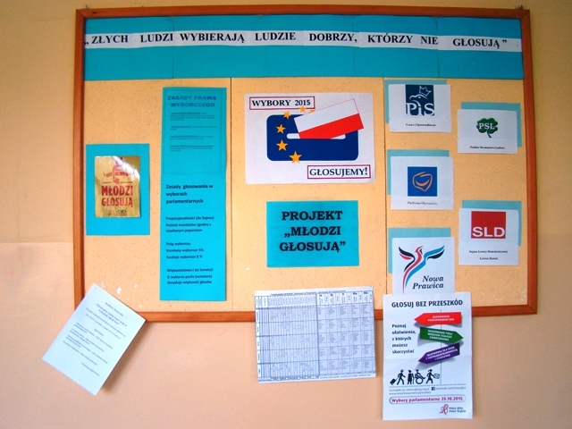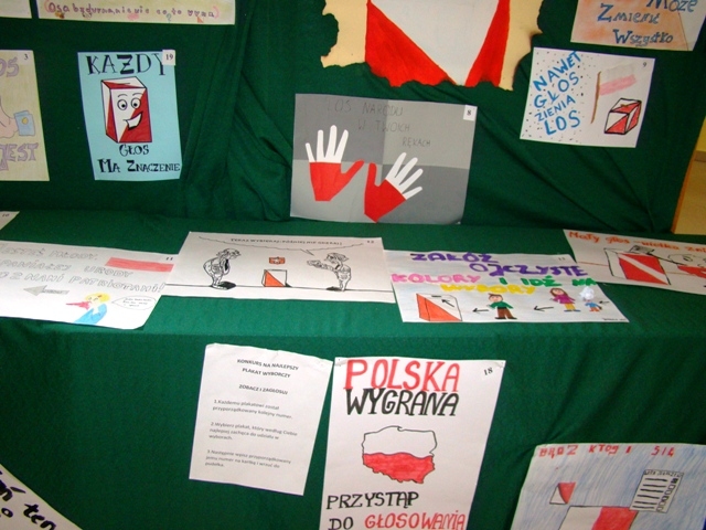 „Głosowanie ważna rzecz, więc w wyborach udział weź” - to motto prowadzonych działań obejmujących 3 zadania w ramach których uczniowie biorą udział w następujących konkursach: literackim, plastycznym i muzycznym. Działania profrekwencyjne rozpoczęły się od przygotowania gazetek. W sali nr 7 gazetkę o kompetencjach, uprawnieniach i zasadach wyboru posłów i senatorów przygotowała nauczycielka historii i WOS-u – mgr Elżbieta Kosiba.