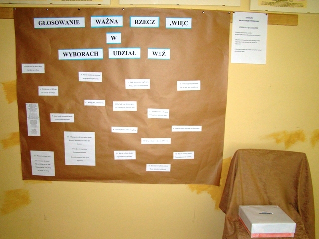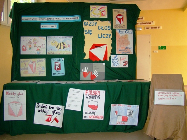 Ukierunkowane przez tego samego nauczyciela uczennice klasy IIIa wykonały na szkolnym korytarzu gazetkę na temat samego projektu, zasad głosowania z uwzględnieniem partii startujących w tegorocznych wyborach parlamentarnych. Uczniowie biorący udział w konkursach zachęcali dorosłych do udziału w wyborach poprzez wyborcze rymowanki, plakaty i piosenki. Ze wszystkich prac uczniowskich w formie rysunków lub plakatów przygotowana została wystawa o tematyce wyborczej. Jest ona ogólnodostępna dla ogółu społeczności szkolnej, a także dla tych, którzy szkołę odwiedzają. Rymowanki i wiersze stały się podstawą do przygotowania drugiej wystawy prac uczniowskich – tym razem w formie literackiego konkursu. Wszyscy uczniowie szkoły mogą wziąć udział w prowadzonym przez grupę projektową plebiscycie na najlepszą rymowankę wyborczą oraz najlepszy plakat wyborczy, który poprzez treść i wykonanie zachęca do udziału w wyborach. Działania profrekwencyjne uczniów mają zachęcić mieszkańców naszej miejscowości do licznego udziału w zbliżających się wyborach. O tym jakie będą ich rezultaty, będziemy się mogli przekonać 25 listopada- analizując frekwencję wyborczą wszystkich uprawnionych do głosowania.