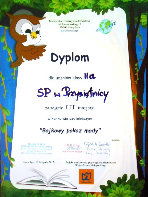 Uczniowie z klasy IIa i IIb wzięli udział w konkursie czytelniczym pt. „Bajkowy pokaz mody” w ramach projektu „Czytanie rozwija wyobraźnię”. Celem tego konkursu było zwiększenie zainteresowania książką jako rozrywką i źródłem informacji, rozbudzanie zainteresowań czytelniczych uczniów, rozwijanie twórczej wyobraźni dzieci oraz zachęcenie do sięgania po lekturę, jako atrakcyjnego sposobu spędzania wolnego czasu.
