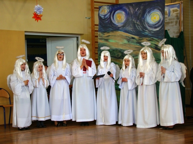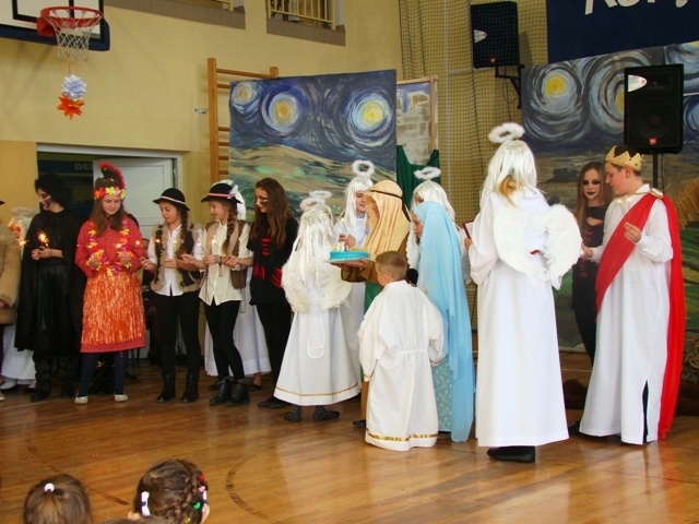 Po przedstawieniu Pan Dyrektor, Samorząd Uczniowski i inne organizacje szkolne złożyli życzenia wszystkim zebranym. Na koniec wspólnie pokolędowaliśmy przeżywając radość Bożego Narodzenia. Następnie uczniowie wraz z wychowawcami rozeszli się do klas, aby połamać się opłatkiem.