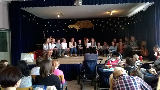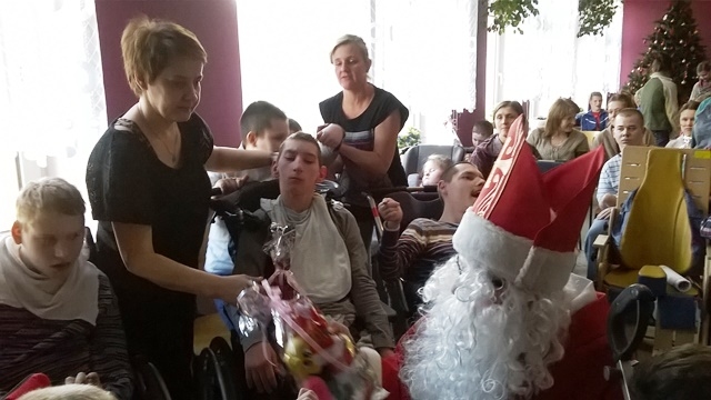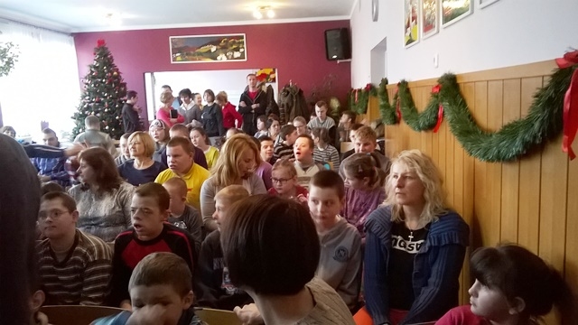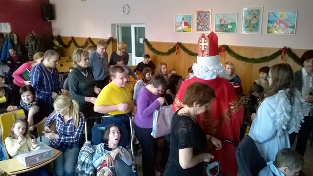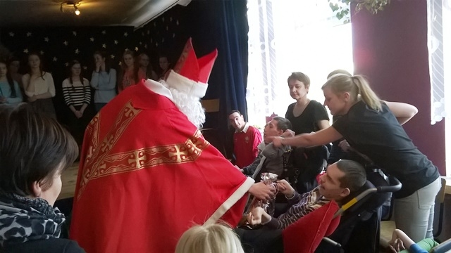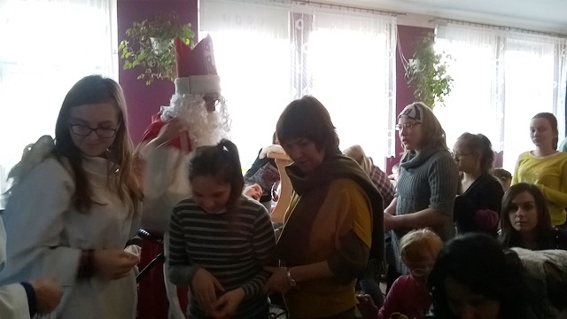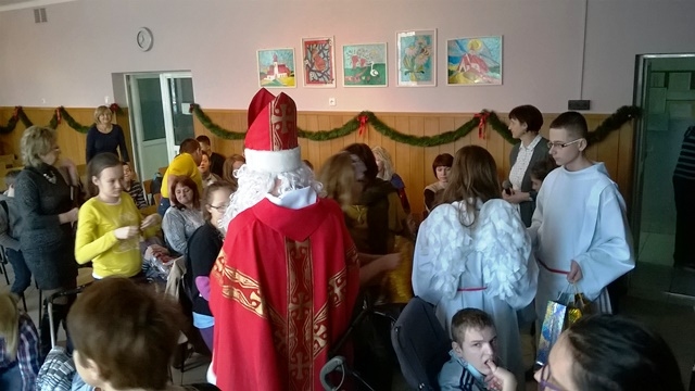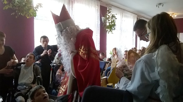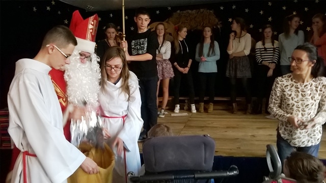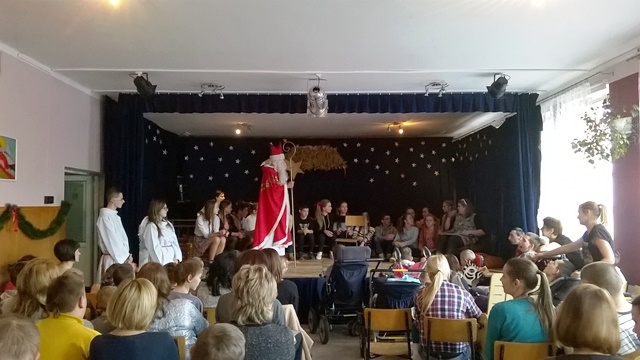 14 grudnia 2015 roku grupa wolontariuszy pod opieką pani Magdaleny Cieślewicz oraz Alicji Nakielskiej, udała się do Szkolnego Ośrodka Szkolno - Wychowawczego w Nowym Sączu. Tam uczniowie spotkali się z niepełnosprawnymi rówieśnikami i ich opiekunami. Gospodarze przyjęli nas bardzo życzliwie, tłumnie wypełniając salę widowiskową, na której nasi wolontariusze zaprezentowali swoje umiejętności aktorskie. Przedstawienie z udziałem Świętego Mikołaja, sprawiło niepełnosprawnym dzieciom wiele przyjemności. Podopieczni ośrodka na swój sposób wyrażali swój entuzjazm i radość z powodu prezentów przywiezionych dla nich. Dzięki zbiórce maskotek, jaka miała miejsce w naszej szkole, udało się obdarować prezentami mikołajowymi 60 uczniów Ośrodka Szkolno- Wychowawczego w Nowym Sączu. Po zakończonym przedstawieniu mieliśmy okazję z bliska przyjrzeć się życiu tegoż ośrodka. Pani pedagog opowiedziała nam o codziennych sprawach i problemach, którym opiekujący się niepełnosprawnymi, muszą stawić czoła. Zapoznaliśmy się ze specyfiką tejże szkoły, obejrzeliśmy korytarze, gdzie podziwialiśmy prace plastyczne uczniów, pozwolono nam wejść do niektórych pomieszczeń, w których uczniowie odbywają swoje zajęcia.