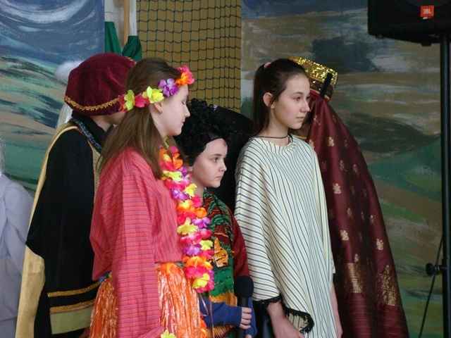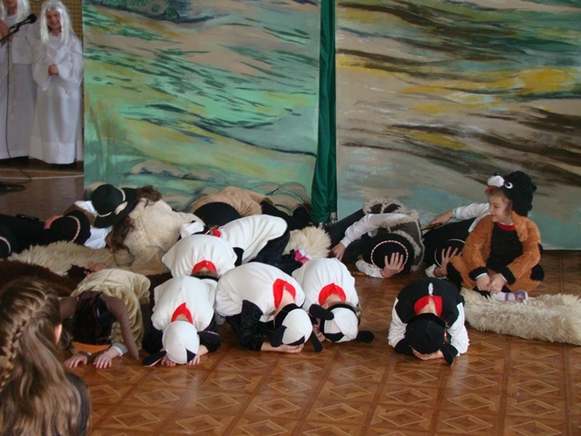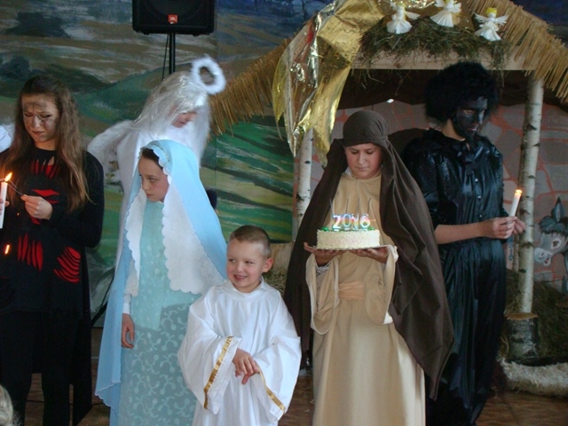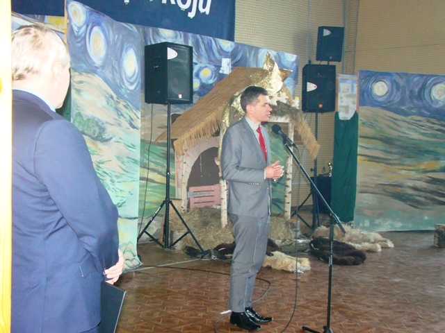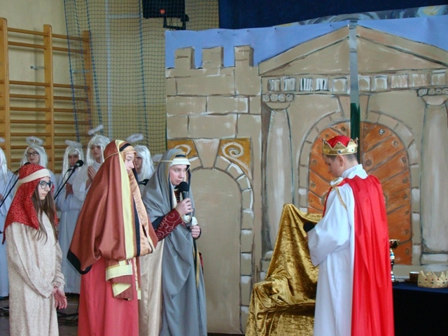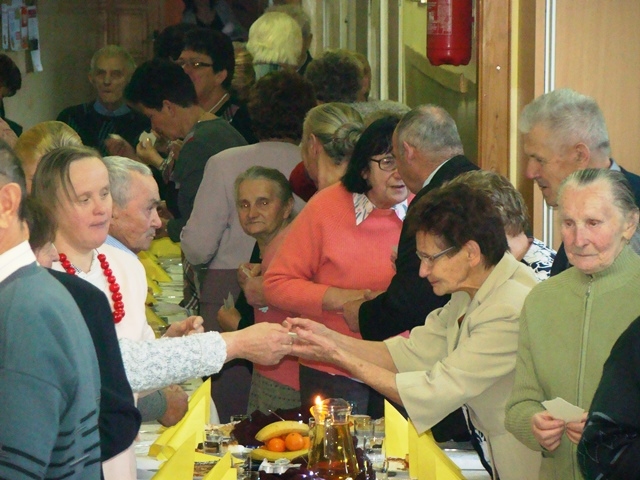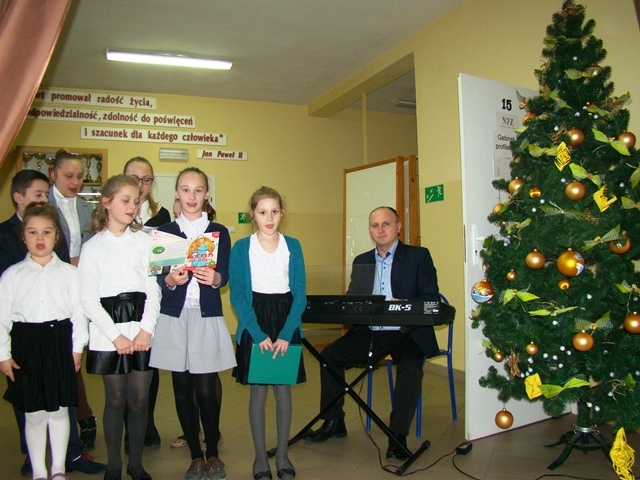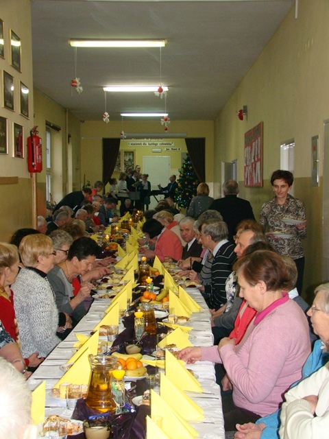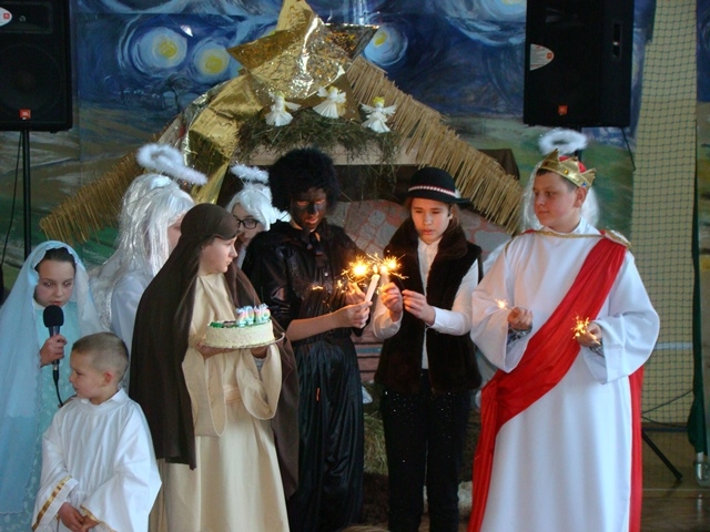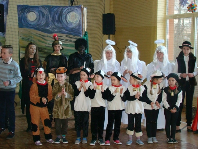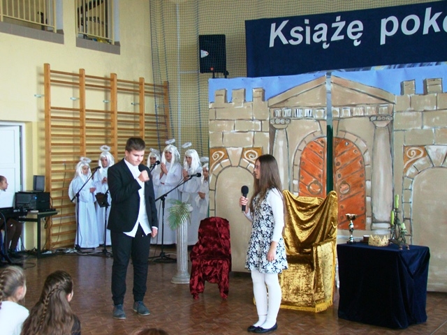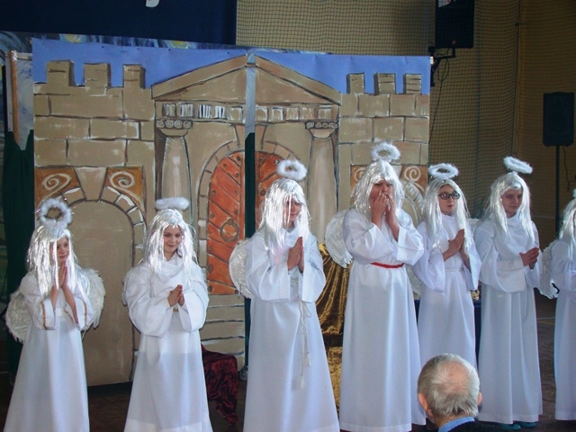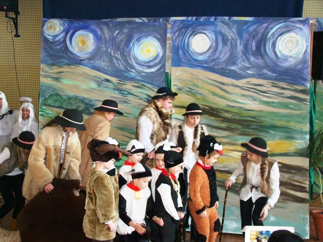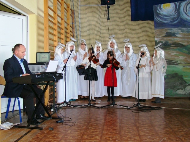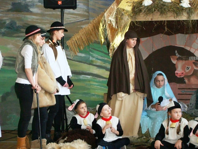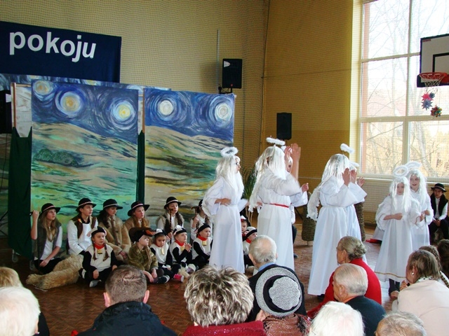 Wczesnym popołudniem budynek szkoły zapełnił się licznie przybywającymi Seniorami i Gośćmi. Na początku na sali gimnastycznej odbyło się przedstawienie jasełkowe pt. „Książę Pokoju” przygotowane przez siostrę katechetkę, Annę Śliwę. W przedstawiane role wcielili się uczniowie klasy Ia gimnazjum oraz klasy VI szkoły podstawowej. Niewątpliwą atrakcją, która wzbudziła największy entuzjazm wśród widzów, były owieczki grane przez najmłodszych uczniów z klasy Ia szkoły podstawowej. Oprawę muzyczną zapewniał zespół wokalny „Amadeo” pod kierunkiem pana Krzysztofa Smydy. Świetnie spisali się również konferansjerzy, Joanna Stawiarska i Dariusz Godawski, którzy wprowadzili wszystkich zebranych w klimat Świąt Bożego Narodzenia.