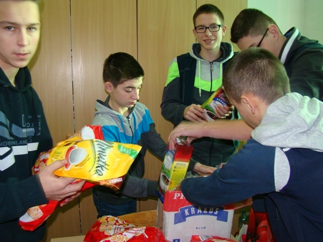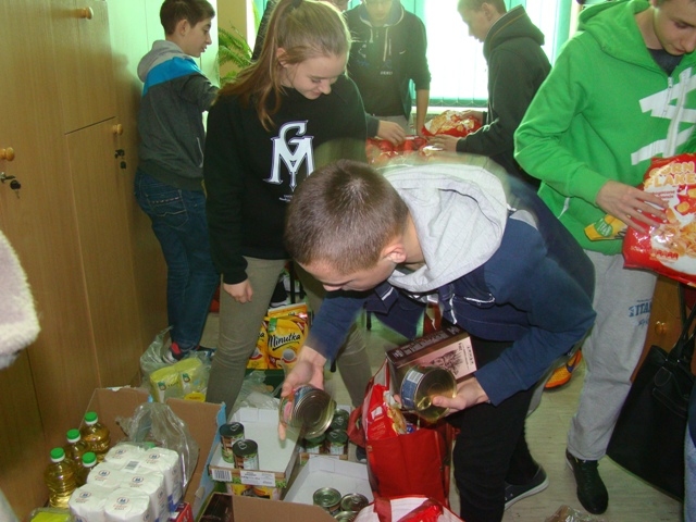 21 grudnia Wolontariat szkolny przygotował paczki żywnościowe dla 17 rodzin z naszego środowiska lokalnego oraz jednej osoby samotnej, które następnie zostały dostarczone rodzinom przez opiekunka Wolontariatu. Produkty żywnościowe do 18 paczek zostały zakupione za kwotę przeszło 1300 zł, którą udało się uzbierać dzięki wysiłkowi i zaangażowaniu dużej liczby Wolontariuszy z naszego Gimnazjum, którzy od września do grudnia 2015 roku przygotowywali i prowadzili różne akcje dobroczynne: między innymi: kiermasz zdrowej żywności, akcje „Zdrowa przegryzka”, kiermasz bożonarodzeniowy i inne.