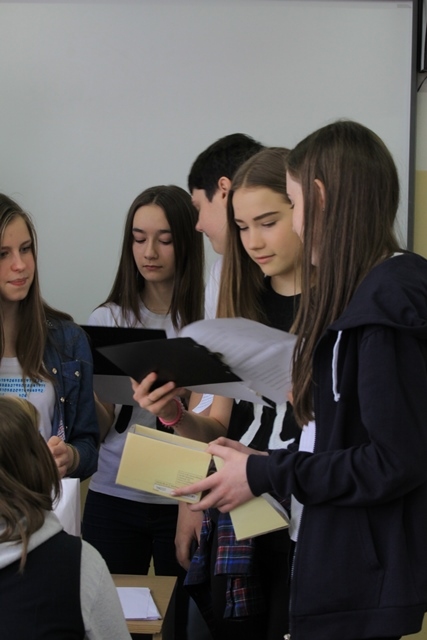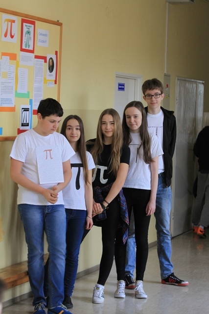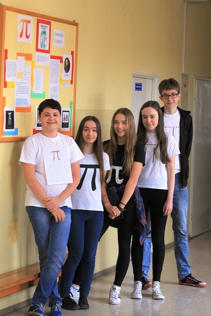 W ramach projektu pod tytułem „Czy bez niej świat byłby okrągły?” przygotowali ciekawą gazetkę na temat pochodzenia i badań prowadzonych przez wieki nad związkami między długością okręgu a średnicą koła. Podali wiele ciekawostek i dziedzin w których wiedza ta jest wykorzystywana. W samodzielnie przygotowanych koszulkach z symbolem najsłynniejszej liczby niewymiernej w czasie przerw zachęcali wszystkich uczniów szkoły do udziału w Quizie na temat wiedzy o liczbie p Każdą dobrą odpowiedź nagradzali słodkim upominkiem. Wszyscy chętnie brali udział w zabawie dydaktycznej.