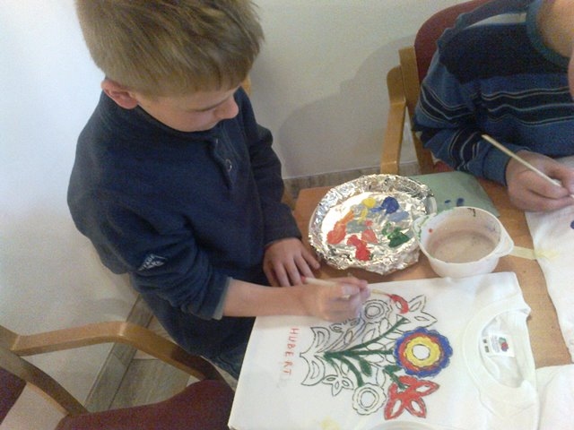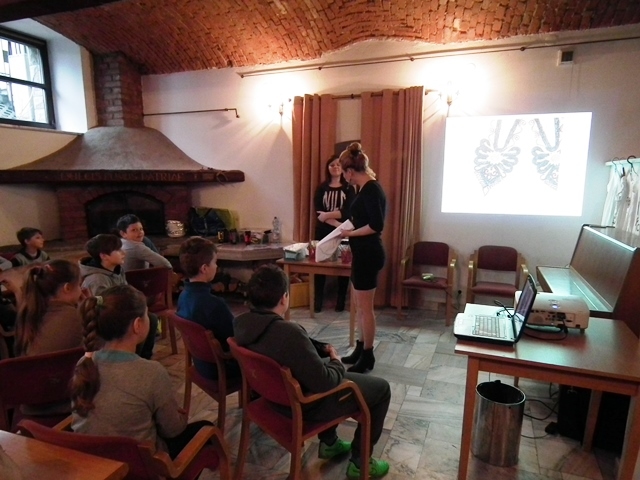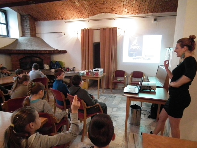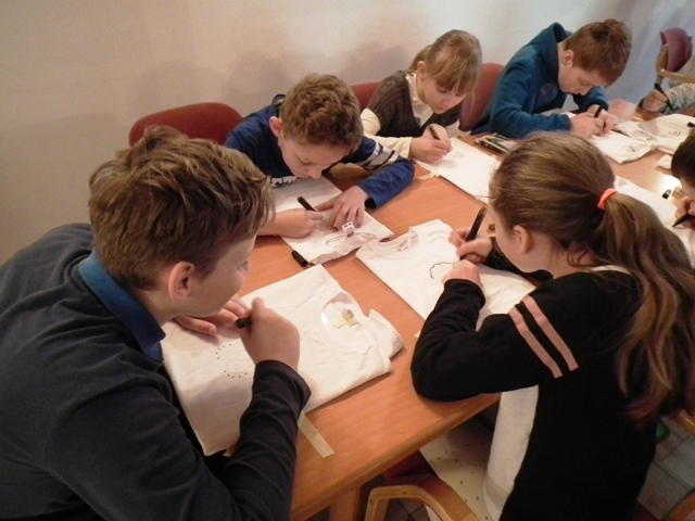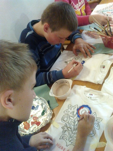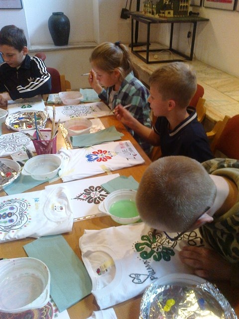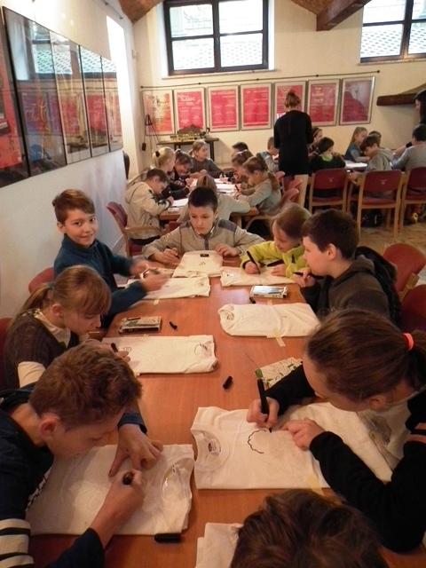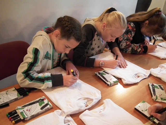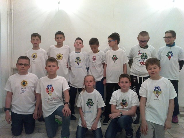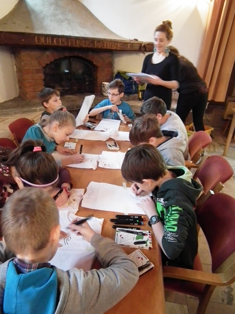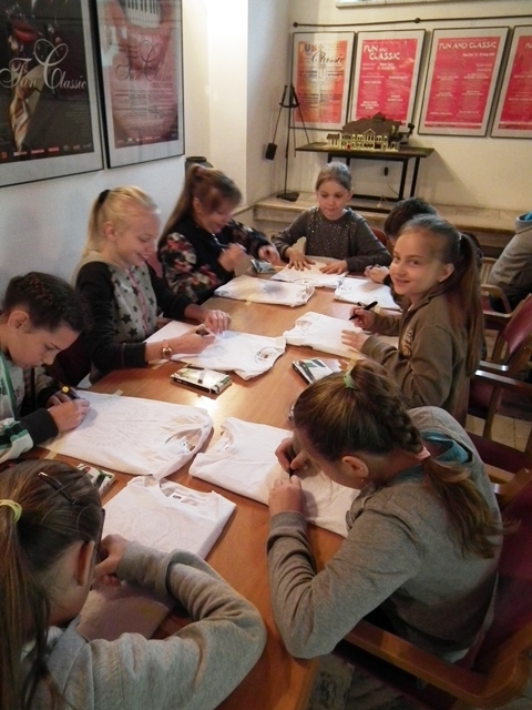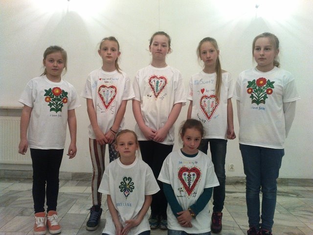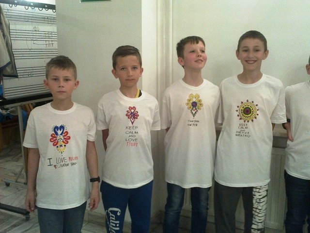 Druga część uczniów wzięła udział w warsztatach „Mała Akademia Folkloru- Etno-Inspiracje”. Uczestnicy zapoznali się z tradycją, obrzędowością, rzemiosłem artystycznym i sztuką ludową wybranych regionów Małopolski. Prowadząca przedstawiła uczniom tajniki powstawania tradycyjnych wzorów i motywów ludowych. W prezentacji multimedialnej i poprzez rekwizyty omówione zostały współczesne oblicza dizajnu inspirowanego folklorem. Uczestnicy dzięki zdobytej wiedzy etnograficznej i kulturowej, zgromadzonym materiałom i katalogom barw oraz wyobraźni twórczej stworzyli etno kolorowe projekty, które przenieśli na T-shirty, które zabrali ze sobą do domów.