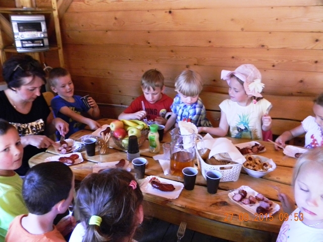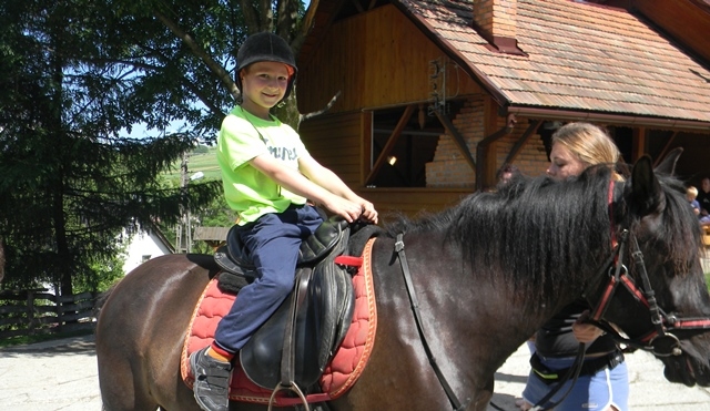 Drugim miejscem, do którego się udaliśmy to gospodarstwo agroturystyczne specjalizujące się w turystyce konnej. Dzieci pod kontrolą instruktorek jeździły na koniach, mogły je głaskać i robić sobie z nimi zdjęcia. Następnie zjedliśmy smakowite kiełbaski z grilla, a na deser spożyliśmy zdrowe owoce.