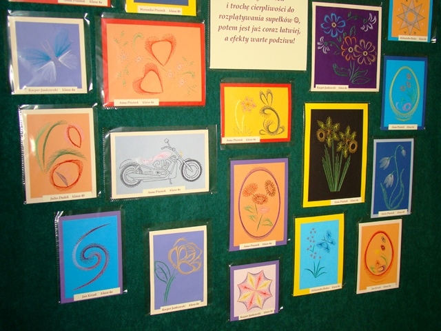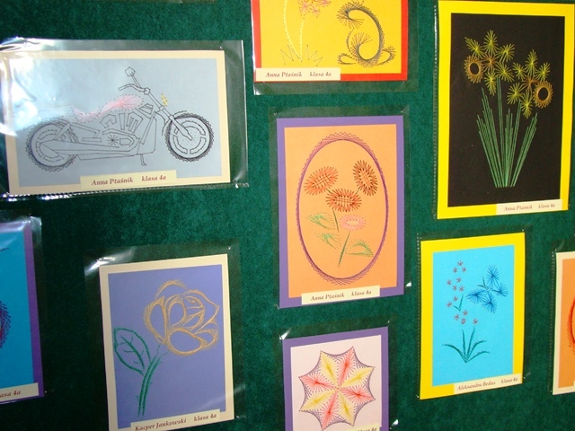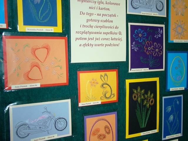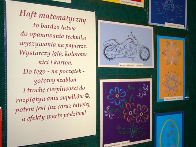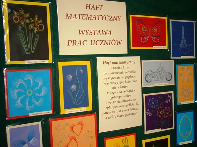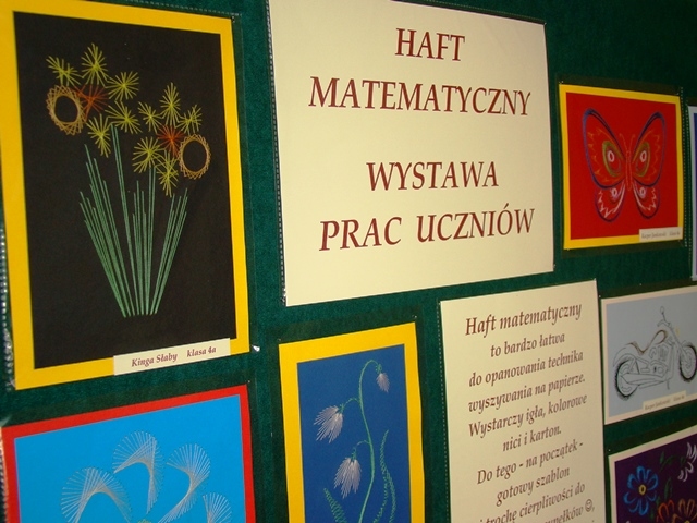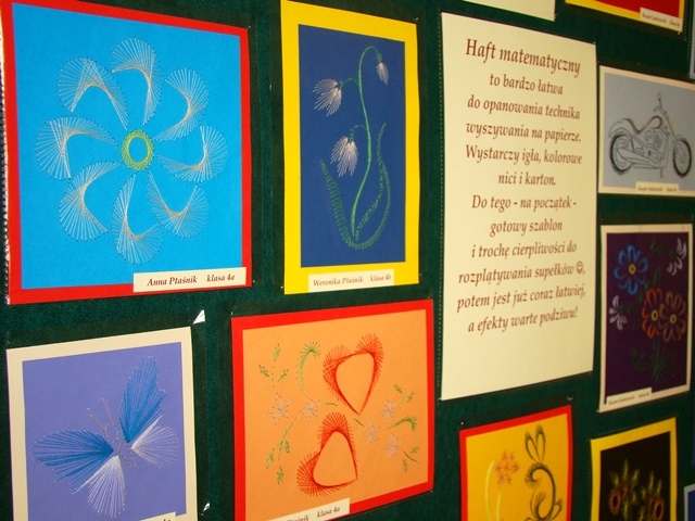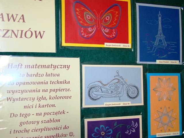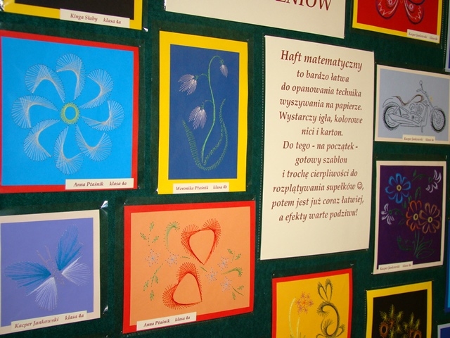Koniec roku szkolnego stał się okazją do podsumowania całorocznej pracy uczniów na zajęciach z haftu matematycznego i pokazania jej efektów. Na zajęcia z haftu matematycznego w roku szkolnym 2015/2016 uczęszczali uczniowie klas czwartych. Zajęcia prowadzone były w bibliotece przez p. Renatę Jachimczak.