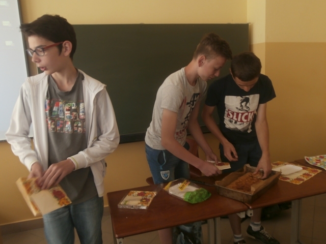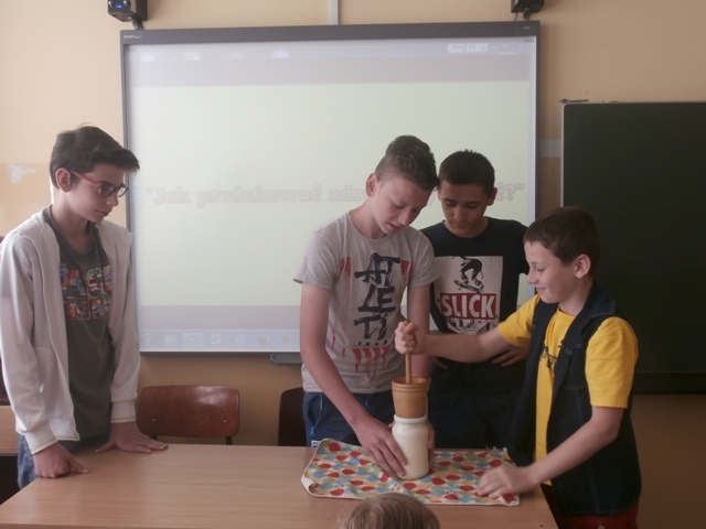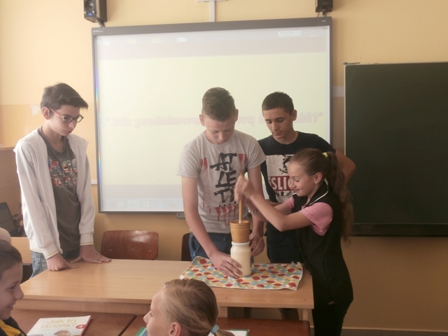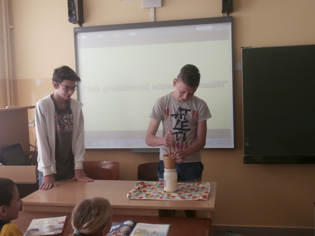 Podczas prezentacji projektu przedstawili prezentację multimedialną, zademonstrowali sposób produkcji masła domowym sposobem.