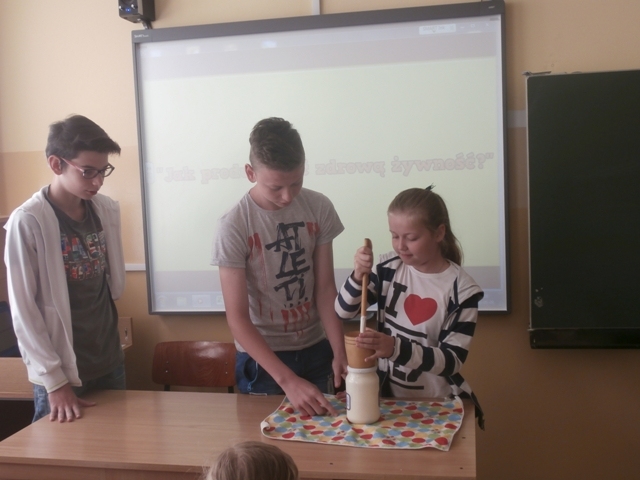 Uczniowie klasy II gimnazjum w składzie : Łukasz Król, Krzysztof Jabrocki, Jakub Olechowski pod kierunkiem opiekuna projektu p. Krystyny Krężel przygotowali prezentacje, dzięki którym uczniowie klasy 4b mogli przekonać się i spróbować, iż wykonanie tzw. „zdrowej żywności” wcale nie jest takie trudne. Pokazali ,w jak prosty sposób można zostać „producentem” zdrowej żywności.