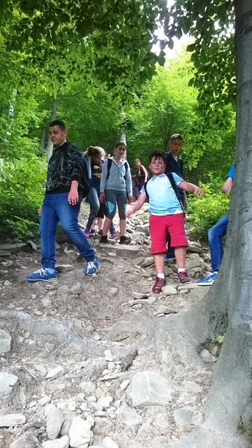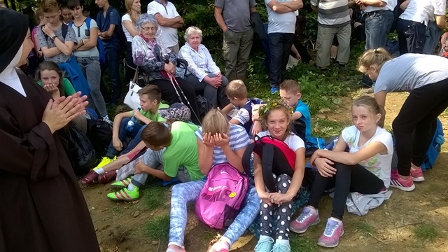 Po tych wszystkich wrażeniach udaliśmy się w kierunku schroniska skąd dobiegła do nas woń grochówki, którą przygotowała dla zgłodniałych uczestników uroczystości, szkoła w Barcicach. Po krótkim oczekiwaniu na swój przydział rozsiedliśmy się na trawie, aby degustować tę wyśmienitą, żołnierską zupę. Ponieważ cały dzień towarzyszyła nam słoneczna pogoda, więc nie za bardzo chciało nam się wracać. Niestety czas nieubłaganie płynął i po godzinie 14:00 ruszyliśmy niebieskim szlakiem w drogę powrotną. Po drodze pokonaliśmy 77 zakrętów i stromizny takie, że niejeden z nas zaliczył twarde lądowanie, a nawet dziurę w spodniach na kolanie. Nikt jednak nie narzekał, przeciwnie jako ci co są „zaprawieni w boju”, z uśmiechem na ustach dotarliśmy do Łomnicy, skąd szczęśliwie wróciliśmy do Przysietnicy.