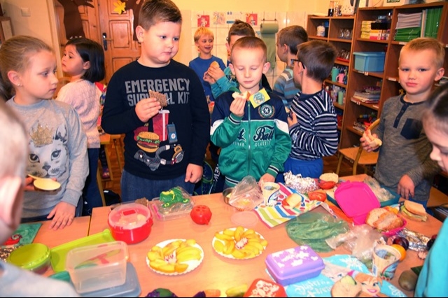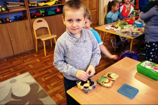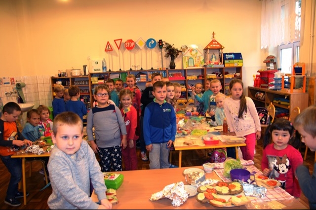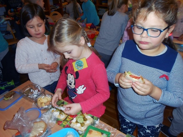 Kolejnego dnia dzieci przyniosły do przedszkola potrzebne produkty, a po starannym umyciu rączek i przygotowaniu stanowisk pracy wszyscy razem zabrali się do pracy. Na stole dominowało ciemne pieczywo, warzywa oraz ser biały i żółty. Przedszkolaki pamiętały również o owocach, ponieważ na stołach pojawiły się jabłka, gruszki, śliwki, winogrona, banany, a nawet owoc kaki. Kanapki nie tylko były smaczne, zdrowe ale i pięknie ozdobione, dlatego też wszyscy z apetytem zjedli przygotowane przez siebie kanapki.