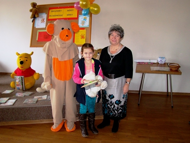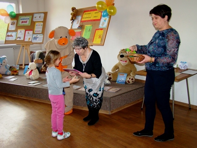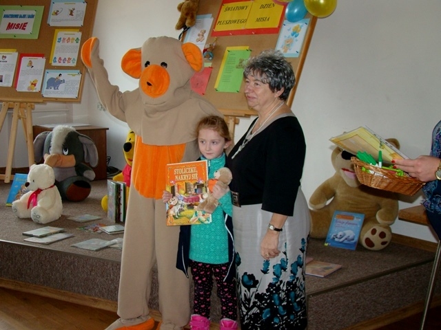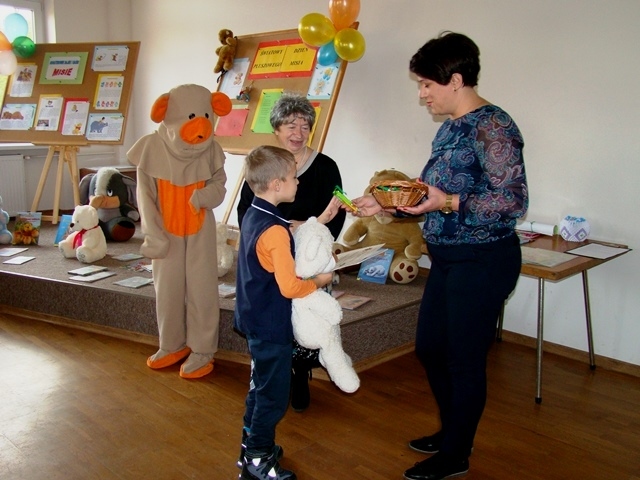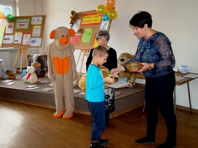 I miejsce otrzymała praca Malwiny Żywczak, II miejsce Oliwii Król, a III miejsce zajęła praca Wiktorii Pawlik. Wszystkim uczestnikom gratulujemy. Uroczystość uświetnił swoją obecnością Miś, który tańczył i bawił się z dziećmi. Spotkanie w Bibliotece Publicznej zakończyło się słodkim poczęstunkiem i pamiątkowym zdjęciem.