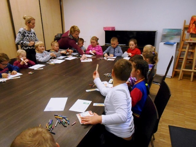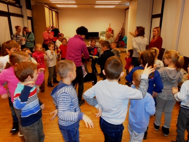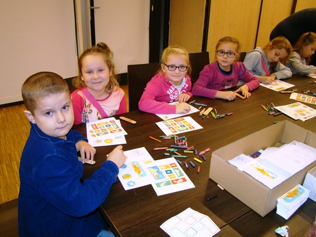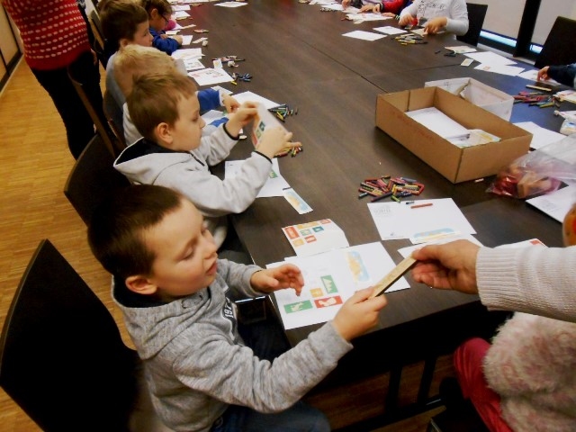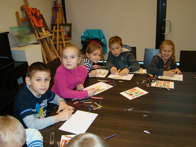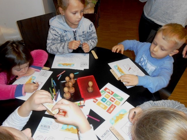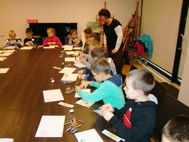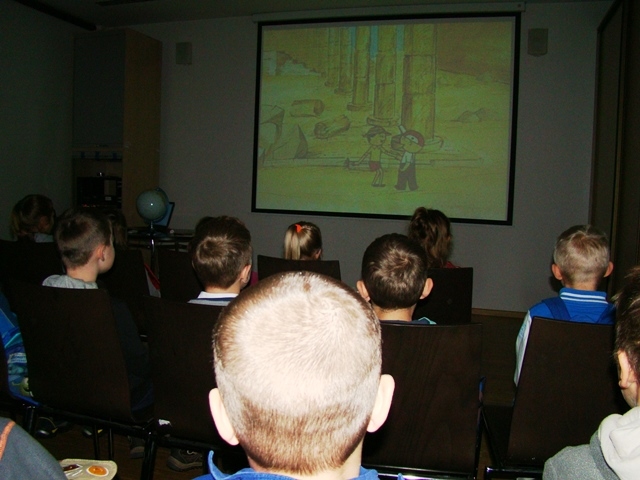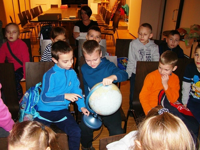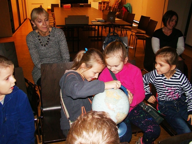 Spotkanie rozpoczęło się od prezentacji odcinka z serii „Bolek i Lolek wyruszają w świat”, stał się on punktem wyjścia do dalszych działań twórczych. Po seansie nastąpiła interaktywna rozmowa prowadzącej zajęcia wraz z uczestnikami dotycząca obejrzanego filmu, wprowadzała dzieci do pracy w formie warsztatowej. Wystarczyło tylko jedno zakręcenie globusem, aby wraz z Bolkiem i Lolkiem twórczo i aktywnie zwiedzać świat. Dzieci samodzielnie projektowały kopertę za pomocą pieczątek i naklejek, kolorowały drewnianą tabliczkę z hieroglifami. Na zakończenie przy muzyce i pląsach uczyły się wiązać turban. Poprzez zabawę pobudzana była wyobraźnia dzieci i chęć poznawania świata.