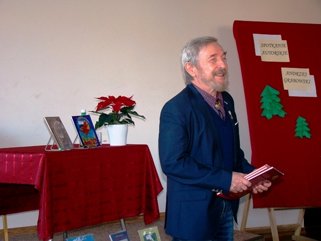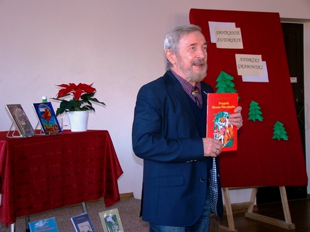 Andrzej Grabowski jest autorem wielu książek dla dzieci, publicystą i satyrykiem, a przede wszystkim Kawalerem Orderu Uśmiechu. Bardzo ciekawie i z humorem opowiadał nam o swoich książkach i ich bohaterach. Każdy uczestnik spotkania mógł zadać pisarzowi pytanie. To było bardzo interesujące wydarzenie, a niektórzy już pytali, kiedy będzie kolejne!