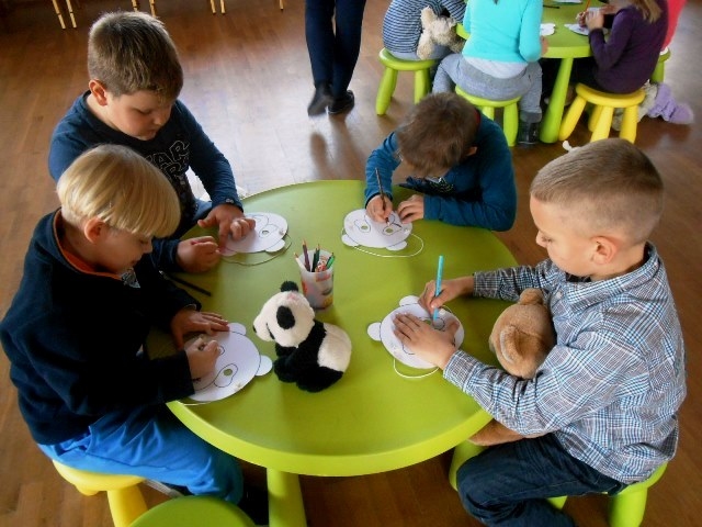Zaproszeni najmłodsi czytelnicy przynieśli swoją najmilszą zabawkę i niezastąpioną przy zasypianiu przytulankę – pluszowego misia. W bibliotece czekał na nich duży pluszowy „Miś”. Po przywitaniu się i po przedstawieniu swoich pluszaków, dzieci wraz ze swoimi ulubieńcami wysłuchały bajek o misiach. Miały także okazję zapoznać się z książeczkami o misiach, które można znaleźć na bibliotecznych półkach. Po przeczytaniu bajki dzieci z dużym zaangażowaniem wykonywały kolorowe maski misiowe. Następnie przyszedł czas na wspólną zabawę przy muzyce. Maluchy w takt piosenki „Jada, jadą misie”, trzymając swoją maskotkę chodziły na paluszkach podnosząc ją wysoko do góry, przykucały i przytulały się do niej, podrzucały zabawkę i próbowały ją chwytać.