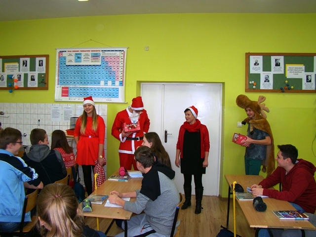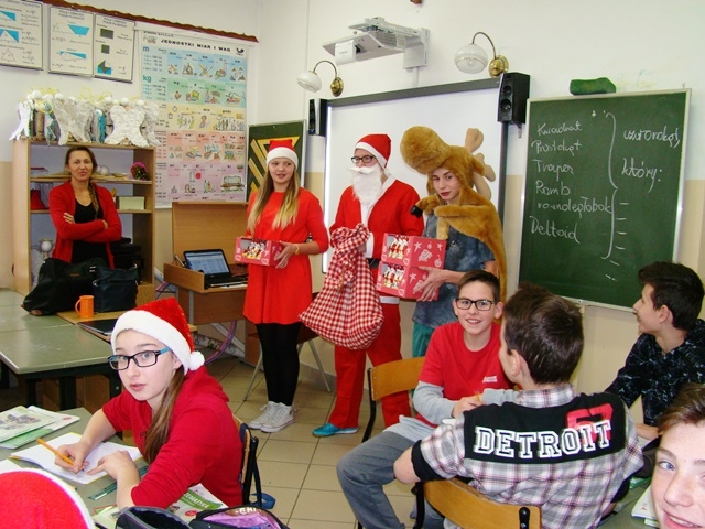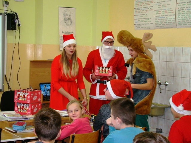 Przedstawiciele SU wraz z opiekunami przygotowali dla każdego ucznia słodki upominek w postaci czekoladowego Mikołaja. Przewodniczący Samorządu Uczniowskiego - Darek Godawski w asyście renifera i śnieżynki odwiedzili wszystkie klasy życząc miłego dnia i wymarzonych prezentów.