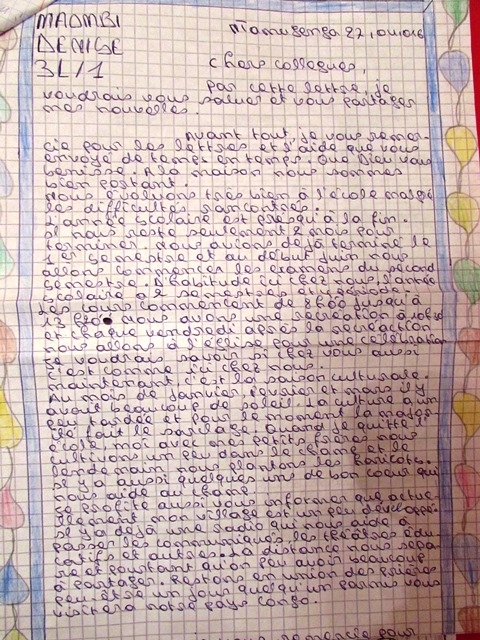 Przez ten list chcę Was gorąco przywitać i podzielić się z Wami moimi nowinami. Przede wszystkim dziękuję Wam za list i pomoc, którą mi ofiarowaliście przez cały czas. Niech Bóg Wam błogosławi. W domu mamy się dobrze. Uczymy się dobrze w szkole, mimo trudności jest w porządku. Rok szkolny się już prawie kończy zostały tylko dwa miesiące nauki. Zajęcia mamy od godziny 8 do 13:20. W każdy piątek o 10:30 mamy przerwę a po niej wspólnie idziemy na Mszę Świętą do Kościoła. Chciałabym wiedzieć jak u Was wygląda szkolny tydzień. Czy jest tak samo jak u mnie? Teraz u nas jest sezon upraw. W styczniu, lutym i marcu było dużo słońca. Uprawa potrafi być ciężka i w tym momencie większość dokonuje pielenia. Kiedy zamykają szkołę ja i moi bracia idziemy do pola. Następnego dnia sadzimy fasolę. Jest kilka dobrych serc, które pomagają nam przy pracy na polu. U nas są teraz korzyści. Poinformuję Was że mamy w wiosce radio, które przekazuje komunikaty i teatry edukacyjne i inne. Dystans nas rozdziela ale jest dużo do przekazania. Zostając w jedności, modląc się, mam nadzieję że któregoś dnia ktoś z Was odwiedzi nasz kraj Kongo.