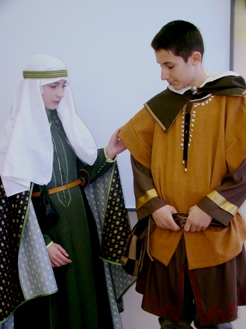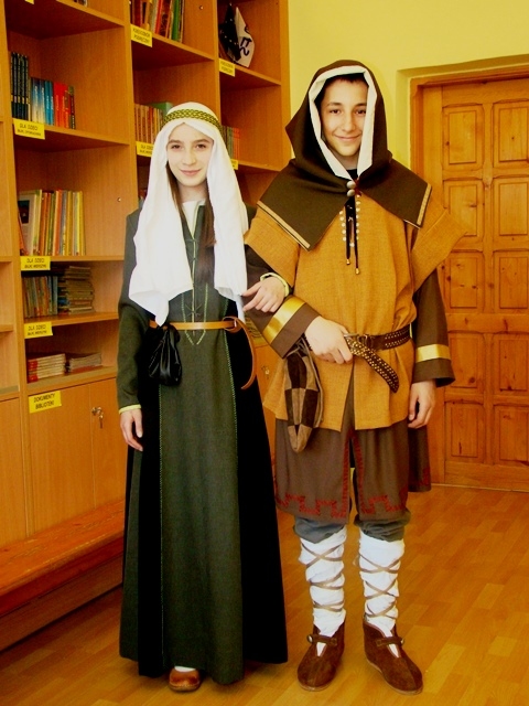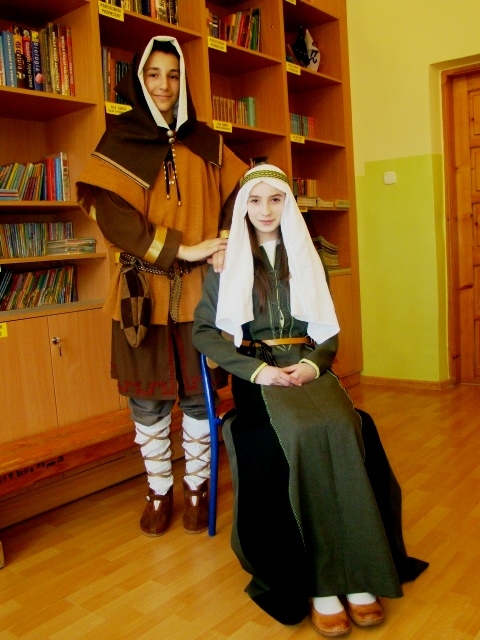 Średniowieczny strój przygotowali uczniowie klasy I Gimnazjum: Olga Mrowca i Krzysztof Ogorzały wraz z opiekunem p. Renatą Jachimczak. Prezentujący podkreślili, że wszystkie elementy swoich strojów starali się przygotować z uwzględnieniem zasad obowiązujących przy robieniu strojów grup rekonstrukcyjnych, czyli dokładnie odwzorowujących techniki szycia i materiały z danej epoki. Toteż jak najwięcej elementów było szytych ręcznie, a we wszystkich częściach stroju nie ma nic plastikowego – zamków czy guzików, bo przecież plastik nie był znany w czasach średniowiecznych. Zatem guziki są wyłącznie metalowe, a dodatki to skóra, rzemyki, bawełniane tasiemki i sznurki.