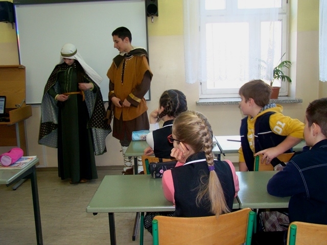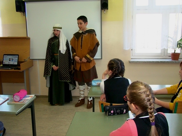 Dzisiaj na lekcji historii uczniowie klasy Va mieli możliwość podziwiać swoich starszych kolegów prezentujących strój średniowieczny. Okazją ku temu była próba generalna przed jutrzejszym występem gimnazjalistów na konkursie „Życie i kult świętej Kingi patronki Ziemi Sądeckiej”. Tematyka prezentacji nawiązywała do treści opracowywanych właśnie na lekcjach.