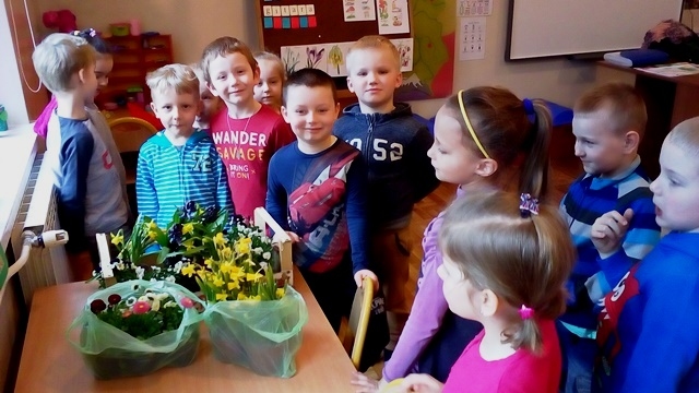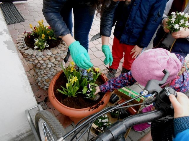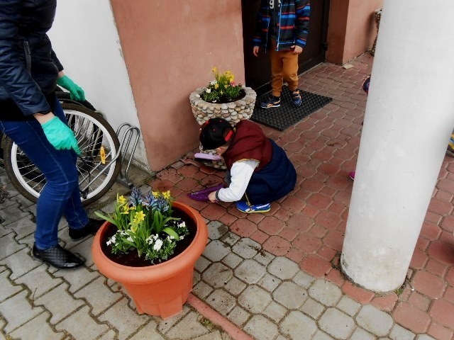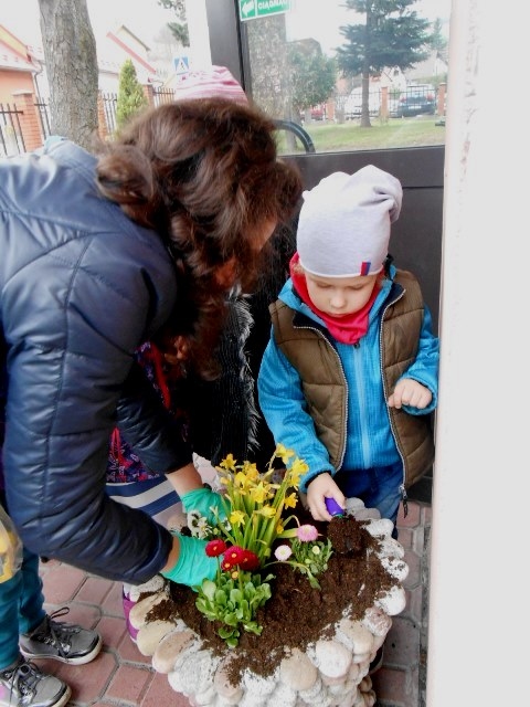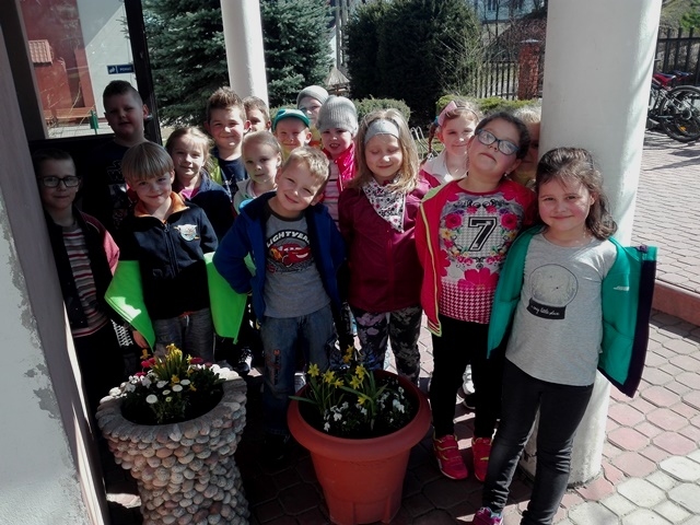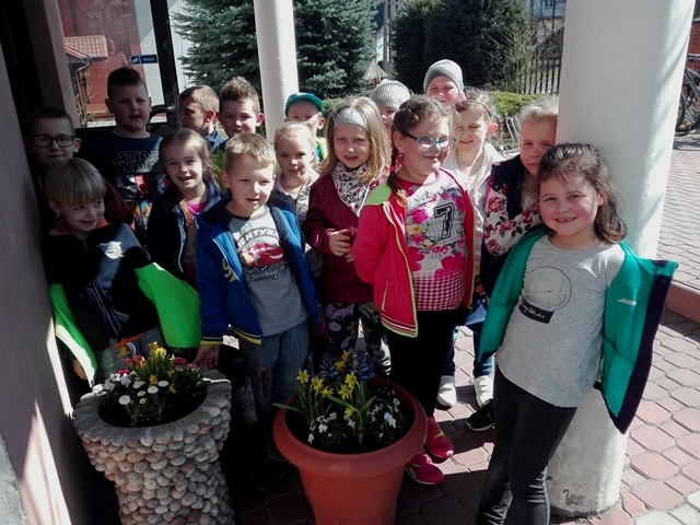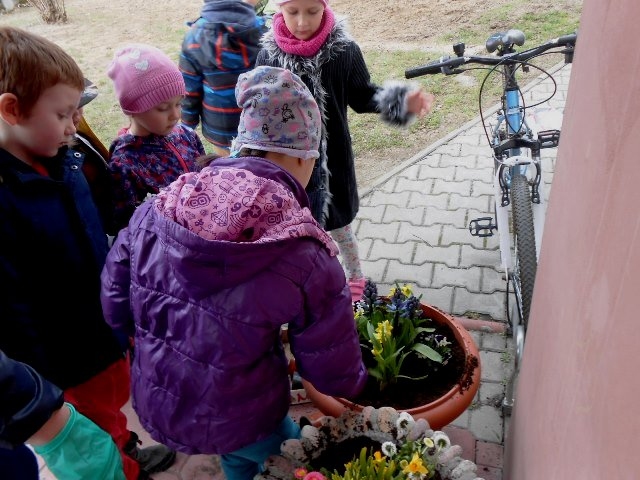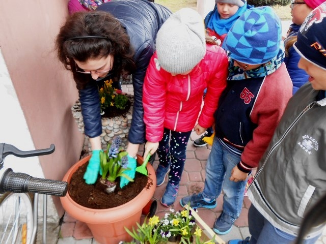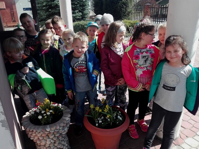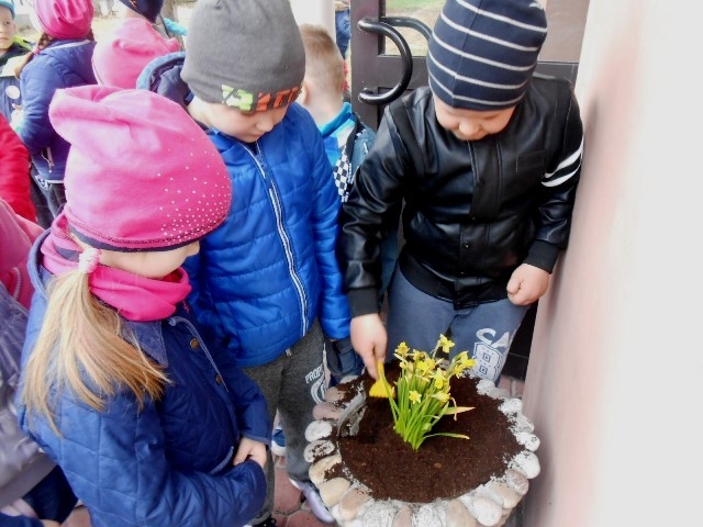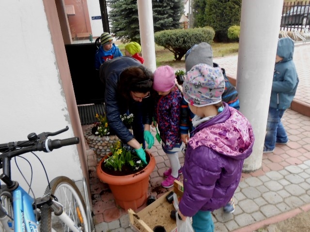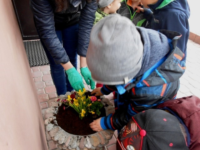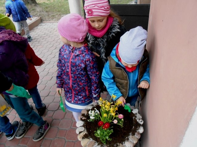 Wiosenna pogoda zachęciła dzieci z grupy 0-1 i 0-2 do prac ogrodowych. W ramach zajęć edukacyjnych dzieci miały okazję samodzielnie zasadzić przy szkole wiosenne kwiaty – żonkile, stokrotki, bratki i hiacynty. Dzieci bardzo chętnie i aktywnie uczestniczyły w pracach z tym związanych. Zabawa przy tym była wyśmienita, pełna wrażeń i bogata o nowe doświadczenia i wiadomości. Dzieci poznały nazwy wiosennych kwiatów i dowiedziały się, że należy dbać o estetykę najbliższego otoczenia.