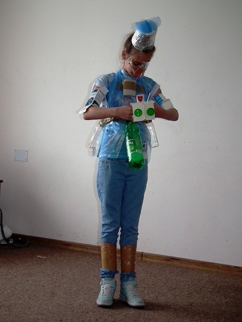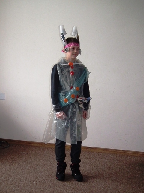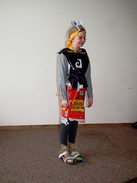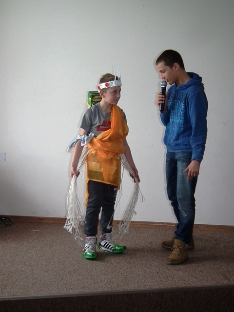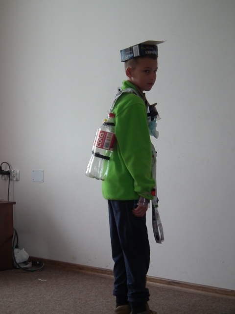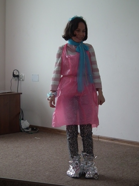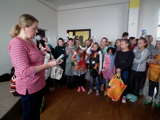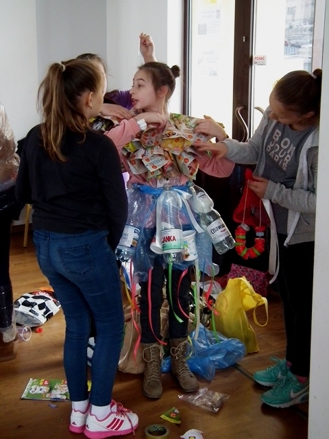 Po prezentacji rozpoczęła się druga część zajęć. Uczniowie pracując w grupach wykonywali strój ekologiczny z odpadów i materiałów ekologicznych. Wszyscy z ogromnym zaangażowaniem zabrali się do dzieła, którego efekty widoczne są na zdjęciach.