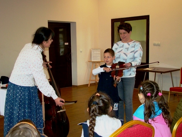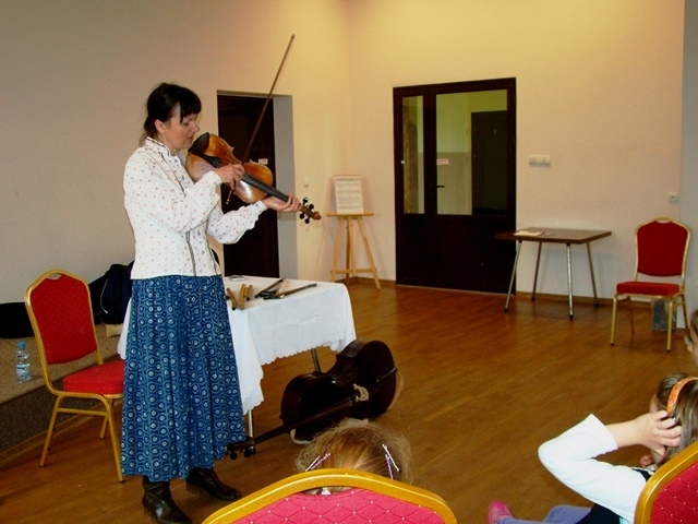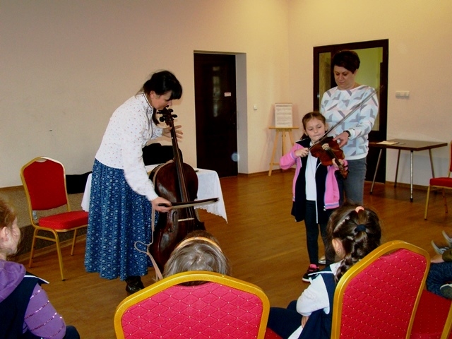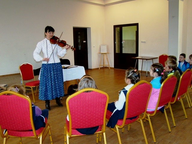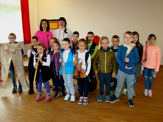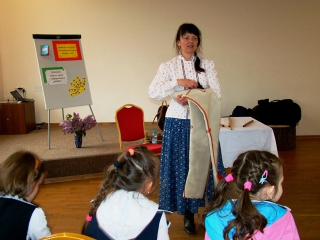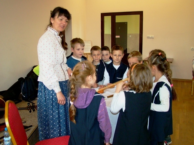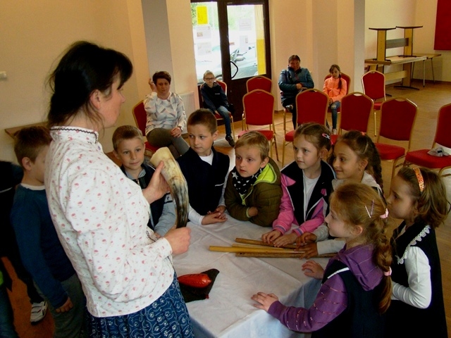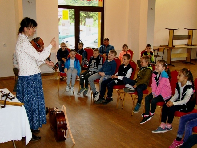 Prowadząca przybliżyła uczniom charakterystyczne cechy kultury ludowej. Uczestnicy warsztatów dowiedzieli się, że w Przysietnicy żyli górale, zaś mieszkańcy Moszczenicy wywodzą się z Lachów.  Artystka zaprezentowała się w stroju góralskim złożonym z koszuli i długiej niebieskiej spódnicy zwanej farbanicą. Omówiła i pokazała również elementy stroju ludowego dla  mężczyzn - białe spodnie z sukna zwane chołośniami, z czerwonymi wypustkami i pomponami, które odbijały uroki. W dalszej części warsztatów pierwszaki nauczyły się śpiewać piosenkę „Świadyrydom” oraz poznały instrumenty ludowe, na których miały możliwość zagrać, były to: basy, skrzypce, fujarki, okaryna, piscołka krawędziowa, lira korbowa i róg.