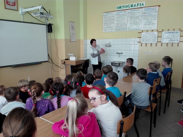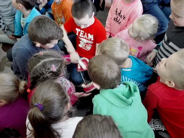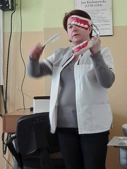 Podczas powitania wiosny nie zabrakło także specjalnej prelekcji, przygotowanej przez naszą Panią Pielęgniarkę - p. Martę Pawlik, która dotyczyła prawidłowego dbania o higienę jamy ustnej. Na specjalnym modelu Pani Pielęgniarka przedstawiła, jak należy prawidłowo szczotkować zęby oraz opowiedziała o różnych zagrożeniach czyhających na nas w razie zaniedbania tej czynności.