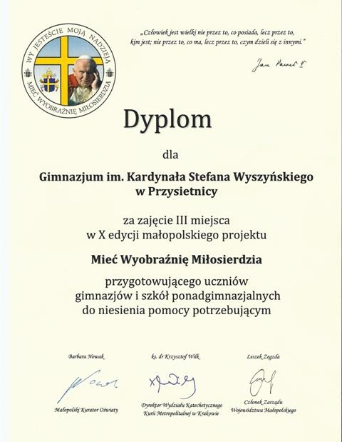 Wczesnym rankiem 29.05.2017 wyjechaliśmy wraz z opiekunami Projektu „Mieć Wyobraźnię Miłosierdzia” p. Zofią Magdaleną Cieślewicz i p. Karoliną Botwiną, do teatru im. Juliusza Słowackiego w Krakowa na Galę finałową. Emocje i radość były tym większe, że za działania podejmowane w ramach X edycji tego konkursu zostaliśmy uhonorowani III miejscem w Małopolsce.
