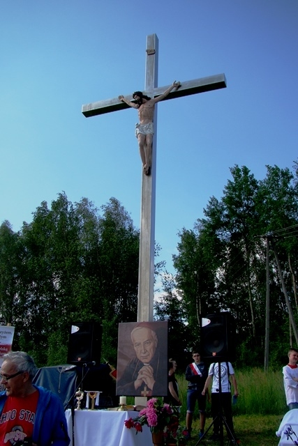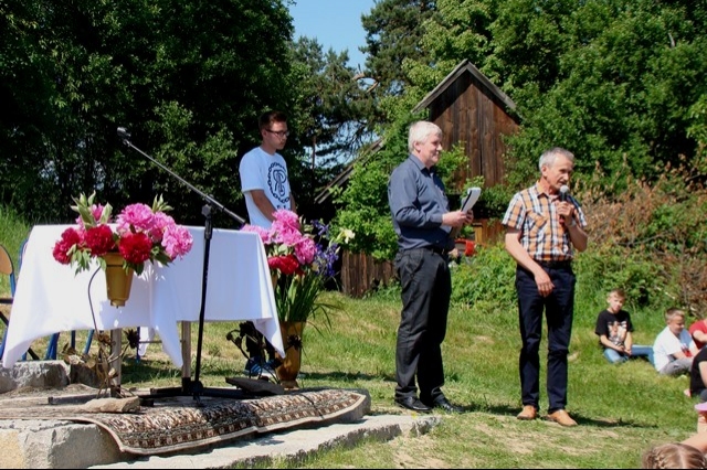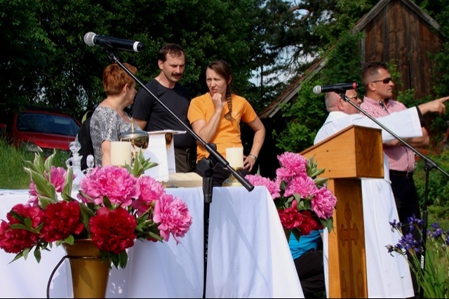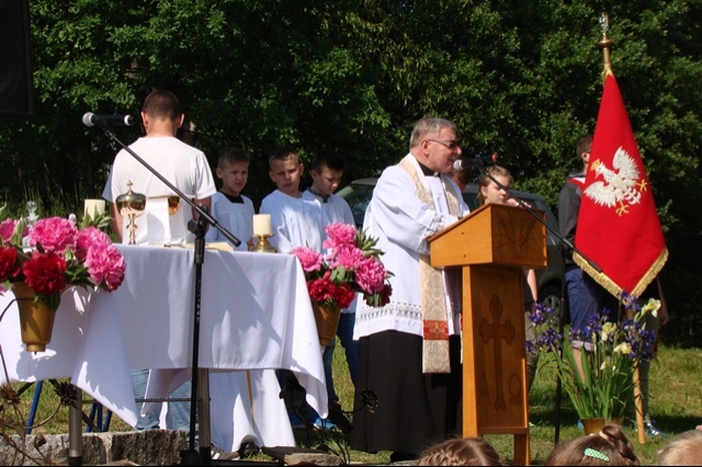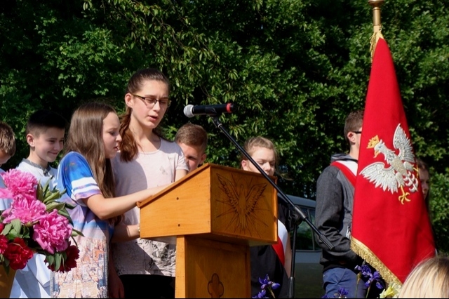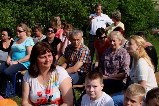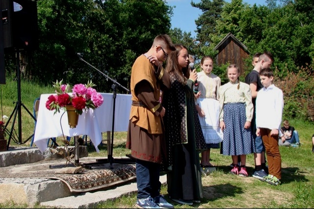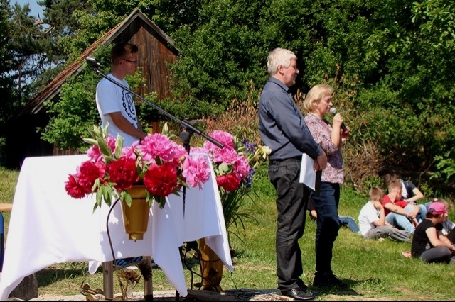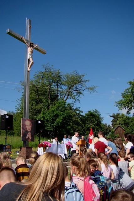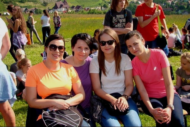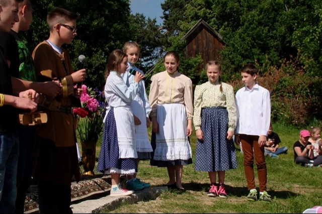 W tym dniu przywoływaliśmy także postać świętej Kingi, mając na uwadze rok poświęcony w naszej gminie jej pamięci. Stosując się do słów papieża Franciszka, nawołującego do „ruszenia się z kanapy”, postanowiliśmy ten dzień spędzić w sposób aktywny, pokazując swoim wychowankom piękno ich rodzinnej miejscowości oraz ciekawy sposób spędzania wolnego czasu bez komórki, czy komputera. Nie bacząc więc na wczesną porę podążyliśmy wszyscy; uczniowie, nauczyciele, pracownicy obsługi w stronę wznoszącego się nad wsią krzyża milenijnego, by tam, w miejscu górującym nad Przysietnicą, mając pewność, że nasze prośby i dziękczynienia zostaną wysłuchane (wszak do nieba bliżej) wziąć udział w plenerowej Mszy Świętej pod przewodnictwem proboszcza, księdza Jana Wąchały i współudziale księdza Mariana Majki – rezydenta tutejszej parafii, który w tym szczególnym dniu wygłosił kazanie. Oprawą muzyczną i nagłośnieniem zajął się pan Krzysztof Smyda – nauczyciel muzyki i zespół wokalny złożony z uczniów klasy II gimnazjum. Następnie w nietypowej, ale jakże pięknej i autentycznej scenerii kwitnących łąk, zielonych lasów i wspaniałych widoków uczniowie pod kierunkiem p. Barbry Owsianka przedstawili legendę związaną ze świętą Kingą i przysietnickim źródełkiem. Potem zebrani wsłuchali się w słowa kardynała Wyszyńskiego, które w takim miejscu nabrały nowego sensu. Ostatnim, ale ważnym punktem występu artystycznego było wspólne odśpiewanie hymnu szkoły z jakże aktualnym przesłaniem: „Chcemy wiernie bronić tej pięknej krainy, która Kindze pieśń śpiewa…” Pierwszą część uroczystości zakończył pan Aleksander Łukasik – dyrektor szkoły, który podziękował zgromadzonym za przybycie, a wszystkim za przygotowanie uroczystości, podkreślając ogromne zaangażowanie wielu osób w logistyczne zorganizowanie wydarzenia w tak niecodziennej scenerii. Słowa uznania dla organizatorów wyrazili zaproszeni goście, pan Kazimierz Ptaśnik - sołtys Przysietnicy i radny samorządowy oraz pani Zofia Golonka – emerytowana dyrektor szkoły.