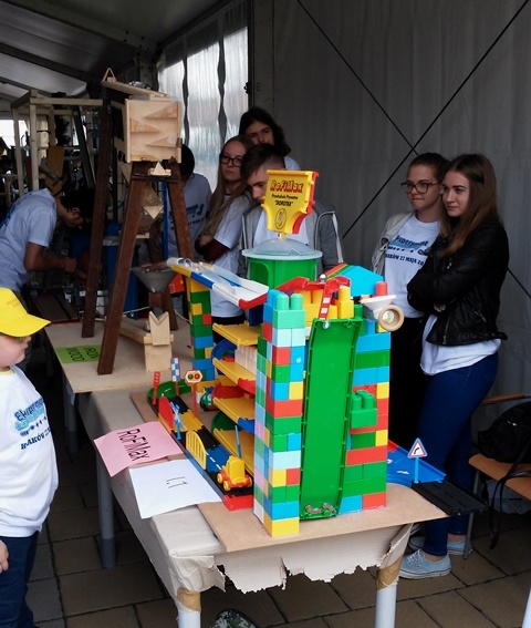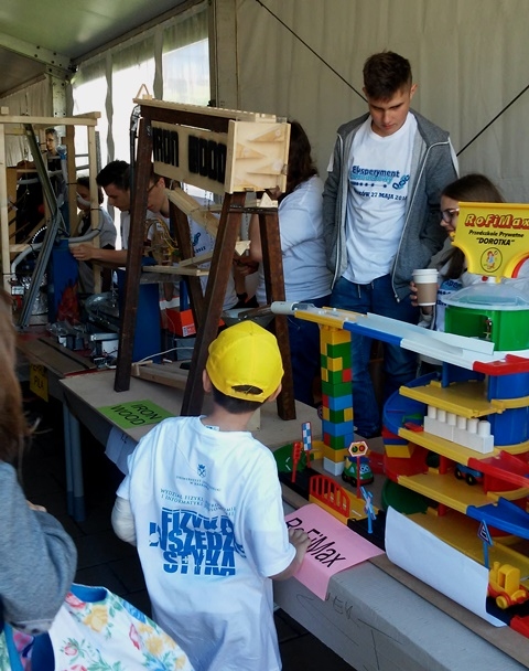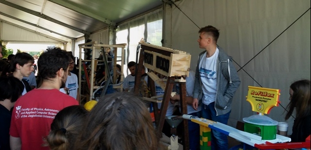 Dnia 27.05.2017r. wczesnym rankiem wyruszyliśmy spod szkoły do Krakowa na Uniwersytet Jagielloński na wydział Fizyki, Astronomii i Informatyki Stosowanej, który był organizatorem V finału Eksperymentu Łańcuchowego 2017 pt. „Fizyka wszędzie styka”, by zaprezentować urządzenie stworzone przez uczniów Joannę Stawiarską, Kamilę Abramczyk i Karola Żelasko pt. „IRON WOOD”, którego zadaniem było transportowanie metalowej kulki z jednej strony urządzenia na drugą wykorzystując przy tym najróżniejsze zjawiska fizyczne. Uczniowie ciężko pracowali w wolnym czasie, by móc zaprezentować swoją maszynę. W finale wzięło udział ponad 200 drużyn z całej Polski w różnych kategoriach wiekowych: od przedszkolaków i uczniów, do studentów i dorosłych pokazując, że fizyka jest uniwersalna i ciekawa, prezentując ją od strony praktycznej. Pierwsze uruchomienie łańcucha, składającego się z połączonych ze sobą urządzeń, skonstruowanych przez finalistów, rozpoczęło się już o 11:15. Kolejne dwa odbywały się w odstępie 45 minut. Eksperyment potrwał do godziny 14:15. Niestety nie stanęliśmy na podium, ale mamy nadzieję, że w kolejnych latach weźmiemy również udział w tym wielkim wydarzeniu. Impreza połączona była z Dniem Otwartym Wydziału Fizyki, Astronomii i Informatyki Stosowanej Uniwersytetu Jagiellońskiego, w ramach którego można było podziwiać mnóstwo atrakcji: m.in. przebiec się po cieczy nienewtonowskiej, budować most, tak jak robił to sam Leonardo Da Vinci, zobaczyć co można stworzyć drukarką 3D, wziąć udział w pokazach fizycznych, warsztatach, wykładach popularnonaukowych, odwiedzić laboratoria naukowe, I Pracownię Fizyczną Instytutu Fizyki UJ, stanowiska studenckich kół naukowych, wymienić książki w ramach akcji bookcrossingu, zorganizowanego przez Bibliotekę Wydziału FAIS. FIZYKA WSZĘDZIE STYKA pokazała nam, że nauka fizyki może być świetną zabawą!