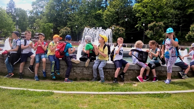 9 czerwca 2017r. uczniowie klas: 0-1,0-2, I, IIa, i IIb wraz z wychowawcami byli na wycieczce autokarowej w Krynicy. Na początku zwiedzili Muzeum Zabawek. Z zaciekawieniem oglądali wszystkie eksponaty, jednak największym zainteresowaniem cieszyły się budowle z klocków lego. Następnie wyjechali kolejką na Górę Parkową i podziwiali piękne widoki na okoliczne miejscowości. Tam też kupili sobie różnorodne pamiątki. Następnym punktem wycieczki było zwiedzanie Pijalni Wody Mineralnej. Każde dziecko mogło degustować wodę mineralną z krynickich źródeł - Słotwinkę. W czasie spaceru po deptaku uczniowie podziwiali piękne fontanny i kolorowe kwiaty ułożone w różnorodne rzeźby. Na zakończenie wycieczki zakupiono lody z lodziarni „Florencja”, które wszystkim bardzo smakowały.