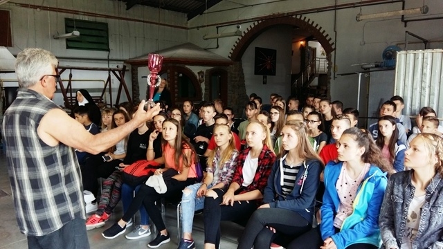 13.06.2017r. uczniowie klasy I, IIa, IIb Gimnazjum wyruszyli wczesnym rankiem na wycieczkę szkolną. Pierwszym punktem na trasie była Huta Szkła w Rymanowie Zdrój, gdzie właściciel - Henryk Rysz - przywitał nas w stroju roboczym i zaprosił do zwiedzania jego zakładu „Sabina”. Młodzież miała okazję zobaczyć halę produkcyjną i pracujących hutników. Wszyscy z zadziwieniem przyglądali się tworzeniu autorskich projektów wyrobów szklanych, prostych figurek zwierząt, a niektórzy z nich mieli możliwość wykonać własnoręcznie szklaną bańkę. Potem wszyscy udali się do galerii unikatowych okazów, które właściciel wystawiał na międzynarodowych wystawach lub wykonywał dla znanych ludzi. W przyzakładowym sklepiku można było kupić przepiękne pamiątkowe wyroby.