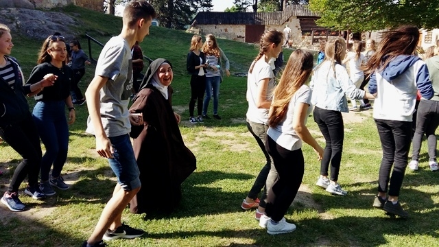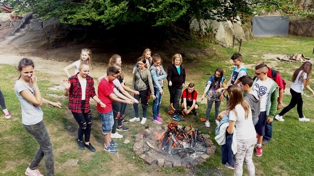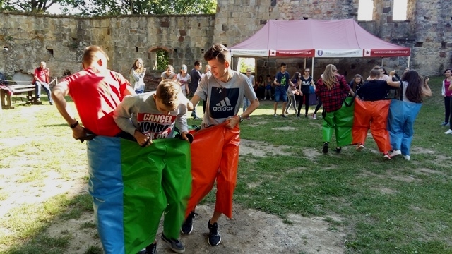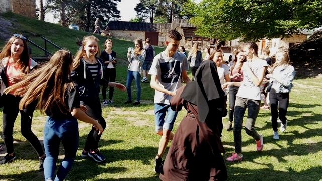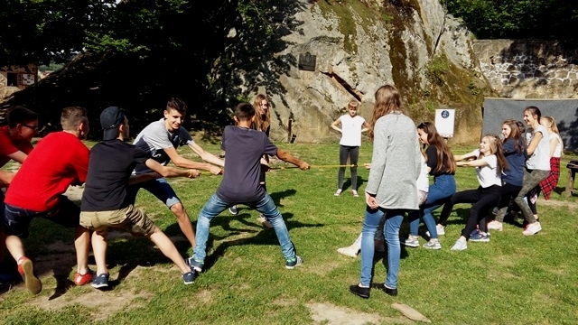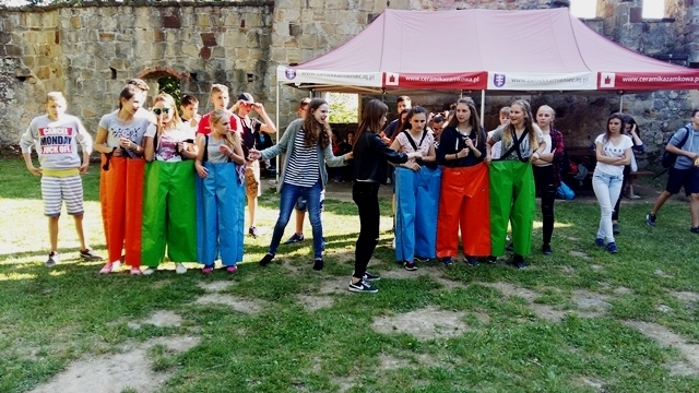 Po intensywnym zwiedzaniu na dziedzińcu czekało na nas ognisko i pyszna kiełbasa. Po ciepłym posiłku panie praktykantki z Technikum Obsługi Turystycznej z Nowego Sącza zorganizowały dla młodzieży zabawy i gry integracyjne. Był taniec belgijski, przeciągnie liny, skoki na skakance, bieg w workach, gra w wyzwania. Dzięki wspaniałej pogodzie i dobrym humorom czas szybko upłynął i trzeba było wracać do domu.