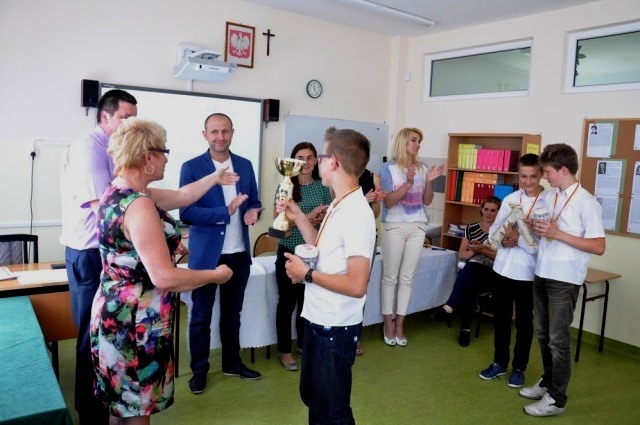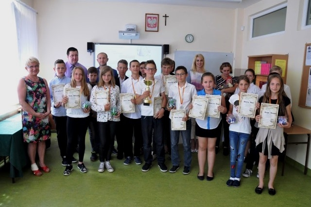 19 czerwca 2017r. w Szkole Podstawowej w Popowicach odbył się gminny konkurs matematyczny. Wzięli w nim udział uczniowie z pięciu szkół z terenu naszej gminy. Naszą szkołę reprezentował zespół w składzie Krzysztof Gał, Kamil Górka i Dawid Waligóra. Nasi uczniowie pokonali pozostałe reprezentacje i zajęli I miejsce, zdobywając tytuł Mistrz Matematyki. Do szkoły przywieźli puchar oraz złote medale.