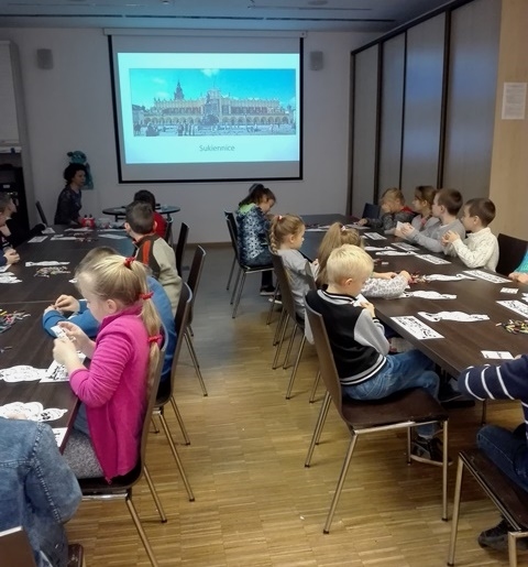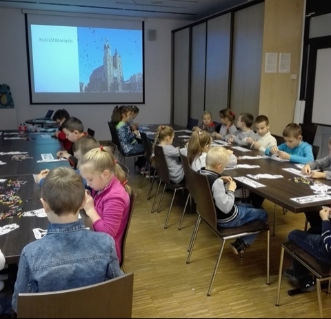 Po krótkiej ekranizacji bajki z serii „Porwanie Baltazara Gąbki” i prezentacji multimedialnej z zabytkami Krakowa, przygotowanej przez Panią prowadzącą, nadszedł czas na samodzielne wykonywanie pracy plastycznej. Na zakończenie i podsumowanie zajęć odbył się quiz wiedzy o Krakowie. Wszyscy uczniowie odpowiadali na pytania, zachwycając swoją obszerną wiedzą na temat zabytków i historii tego pięknego miasta.