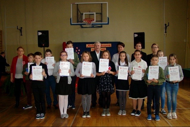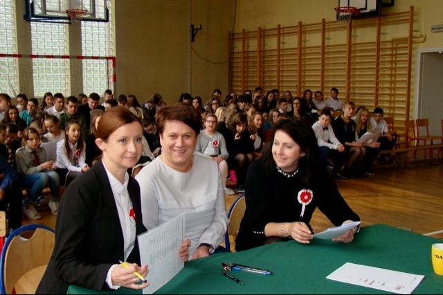 Patriotyzm – czyli miłość do Ojczyzny, w czasach pokoju można realizować w różnorodny sposób. Uczniowie naszej szkoły wzięli udział w organizowanym co roku Konkursie Recytatorskim Poezji Patriotycznej, w przygotowaniach którego pomogli nauczyciele poloniści: p. Katarzyna Dybowicz, p. Anna Golonka, p. Wiesława Łatka , p. Barbara Owsianka oraz nauczyciel bibliotekarz Renata Jachimczak. Tym razem zaprezentowało się łącznie 25 uczestników w dwóch kategoriach wiekowych. Uczniowie recytujący wybrane przez siebie wiersze wykazali się niezwykłą dojrzałością w doborze i interpretacji tekstów. Dlatego jury w składzie p. Wioletta Orłowska, p. Alina Citak, p. Renata Jachimczak miało nie lada problem, aby wybrać najlepszych wykonawców. Na wyniki oczekiwali nie tylko uczestnicy konkursu, ale także publiczność, która kibicowała swoim koleżankom i kolegom. Czekając na werdykt komisji konkursowej wspólnie, żywiołowo śpiewała pieśni patriotyczne.