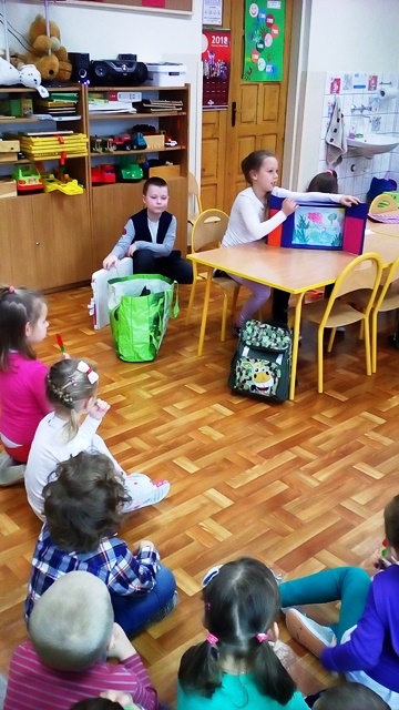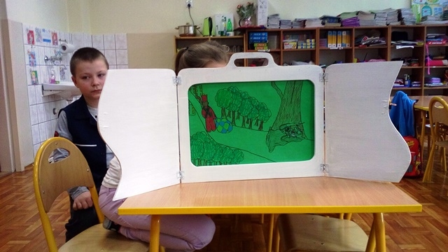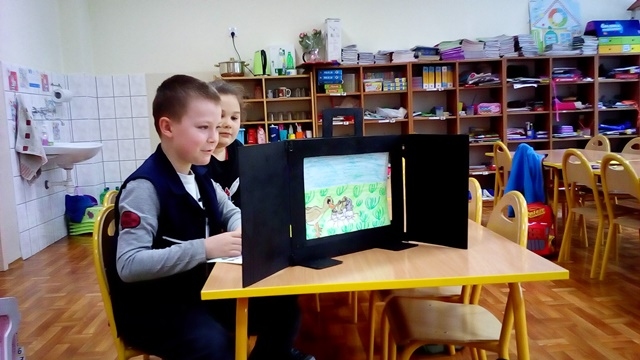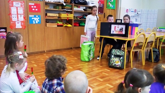 Uczniowie z klasy 3a własnoręcznie wykonali ilustracje do utworów H. Ch. Andersena „Calineczka”, „Krzesiwo”, „Brzydkie Kaczątko” i zaprezentowali przedszkolakom tego typu teatrzyk. Ten pochodzący z Japonii teatr to doskonała forma głośnego czytania dzieciom. Przedszkolaki z dużym zainteresowaniem i skupieniem obejrzały teatrzyk przygotowany przez trzecioklasistów.
