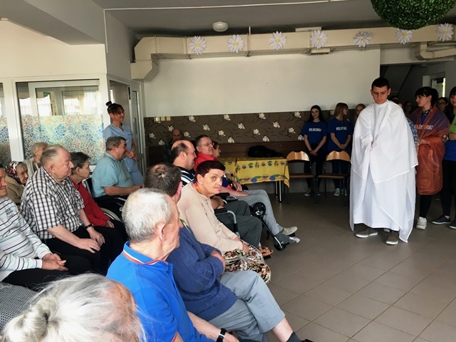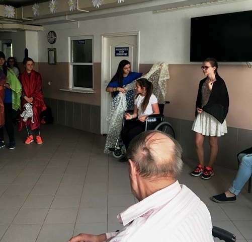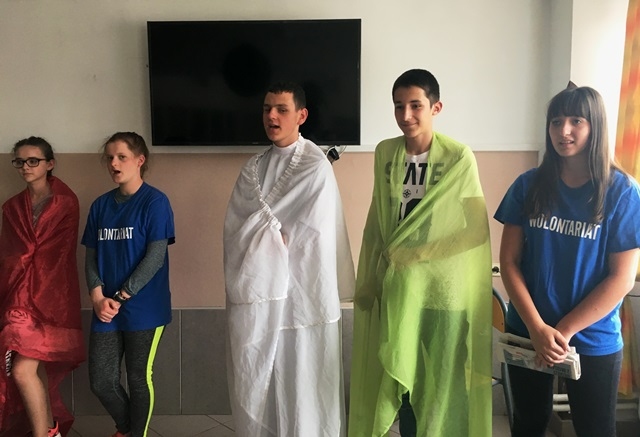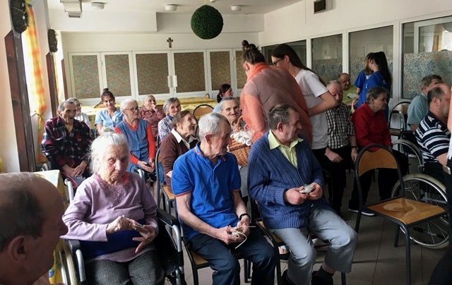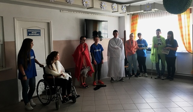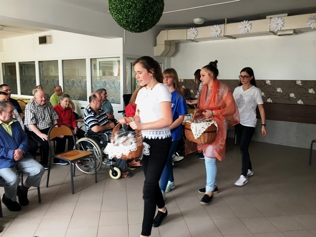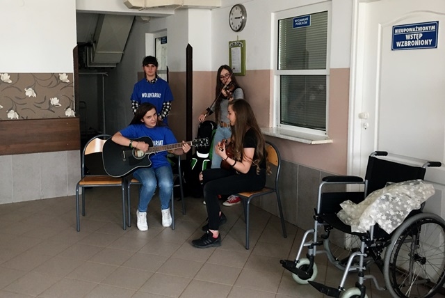 Dnia 23.04.2018 roku – po zajęciach szkolnych Wolontariusze pojechali wraz ze swoim opiekunem p. Magdaleną Cieślewicz na spotkanie z chorymi, podopiecznymi Domu Pomocy Społecznej w Klęczanach. Był to już drugi wyjazd do tej placówki. Podczas spotkania Wolontariusze przedstawili pantomimę opowiadającą o pomocy dzieciom i ludziom potrzebującym wsparcia po czym przy akompaniamencie gitar i skrzypiec wyśpiewali koncert składający się z piosenek o tematyce religijnych oraz z poezji śpiewanej.