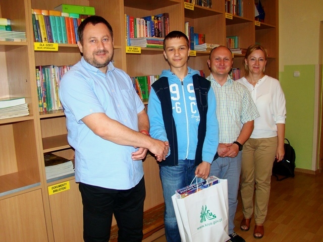 14 maja Dawid odebrał nagrody rzeczowe i gratulacje od przedstawiciela KRUS, który przekazał również drobne upominki dla wszystkich uczestników konkursu z naszej szkoły.