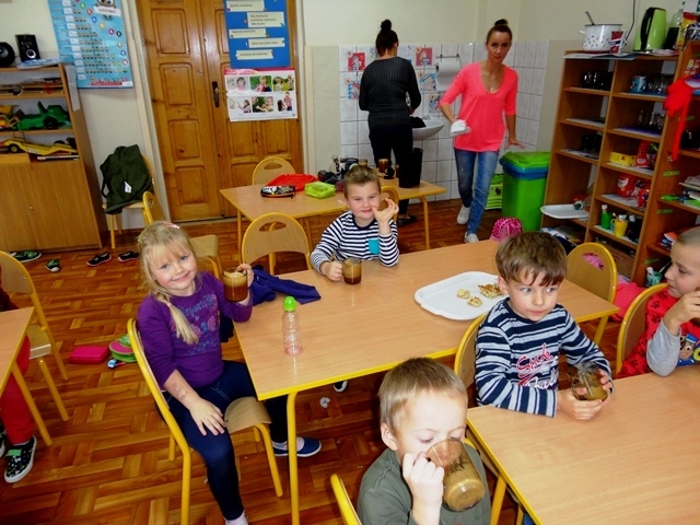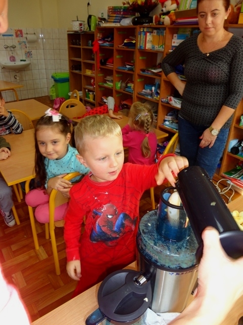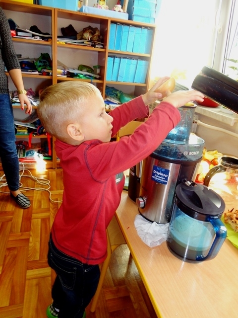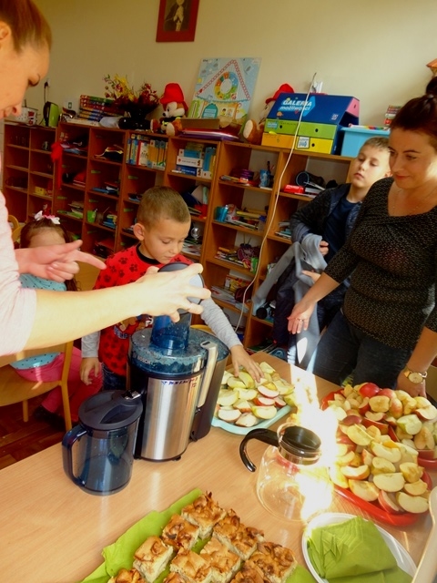 Obchody Dnia Jabłka (4.10.2018r) w przedszkolu rozpoczęliśmy od rozmów na temat jego wyglądu, kolorów, wielkości, kształtu, smaku, różnych odmian, dlaczego warto je jeść, pod jaką postacią i czy tylko ludzie lubią te owoce? Przedszkolaki dowiedziały się, że bardzo ważne jest to, żeby jabłka jeść ze skórką. Należy tylko pamiętać, aby przed spożyciem dokładnie je umyć. W obchody święta włączyli się wszyscy rodzice przynosząc jabłka do szkoły, a w szczególności dwie mamy, które pomogły robić sok z jabłek. Dzieci również mogły poczęstować się pyszną szarlotką, którą wcześniej upiekła wychowawczyni.