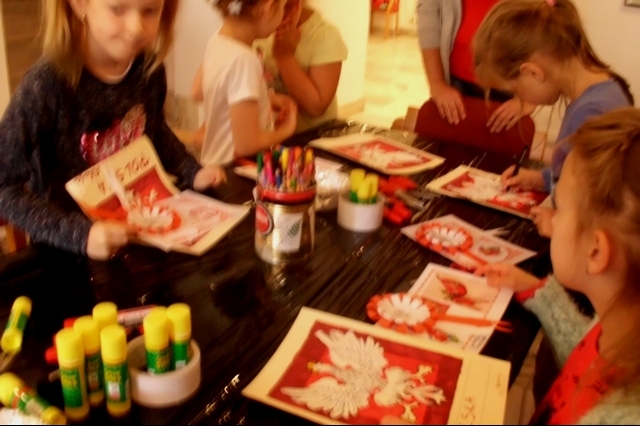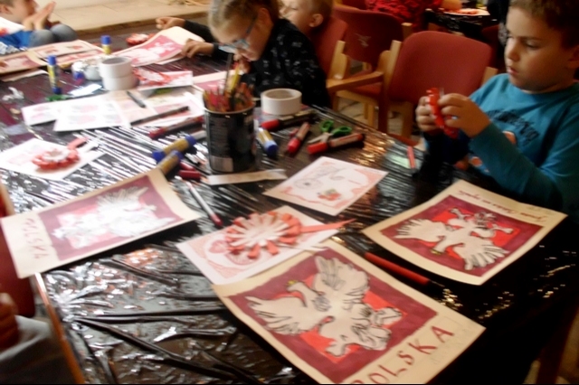 Tematem przewodnim był Orzeł Biały jako godło Polski na przestrzeni wieków. Po krótkiej prezentacji multimedialnej na temat orła w dziejach naszej ojczyzny uczniowie wykonywali biało - czerwone kotyliony, następnie malowali herb naszej ojczyzny, a na zakończenie wykonywali okolicznościową kartkę związaną ze świętami narodowymi. To była ciekawa lekcja historii.