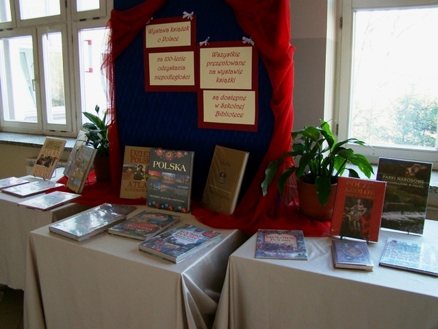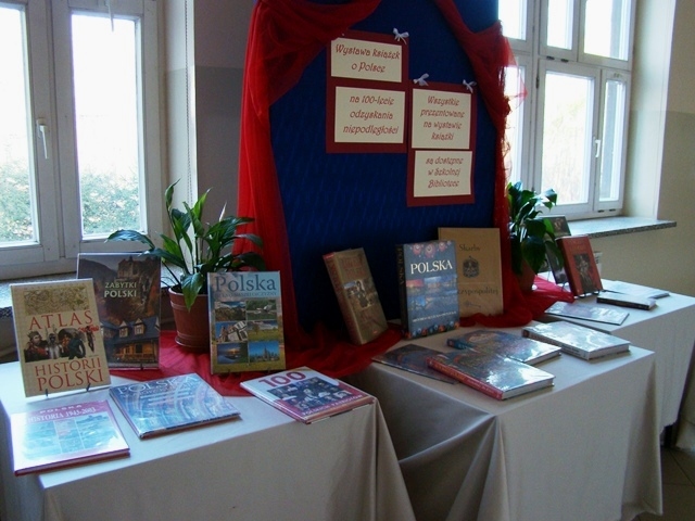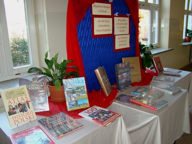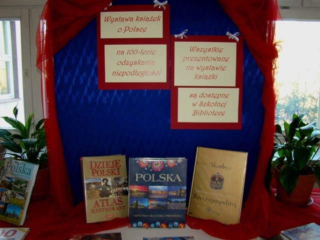 Z okazji uroczystego finału obchodów stulecia odzyskania przez Polskę niepodległości Biblioteka Szkolna przygotowała okolicznościową wystawę książek o tematyce dotyczącej naszej Ojczyzny. Zaprezentowane zostało ponad dwadzieścia różnorodnych wydawnictw popularnonaukowych dotyczących głównie historii naszego kraju ale i również opisujących przyrodę, architekturę i sztukę. Wiele z przedstawionych książek adresowana jest do dzieci, posiada atrakcyjną, bogatą szatę graficzną i zachęca do poznawania dziejów naszego kraju już od najmłodszych lat.