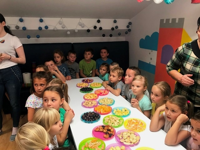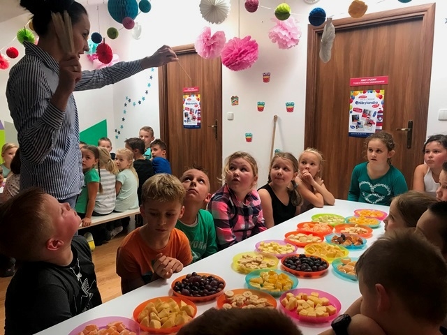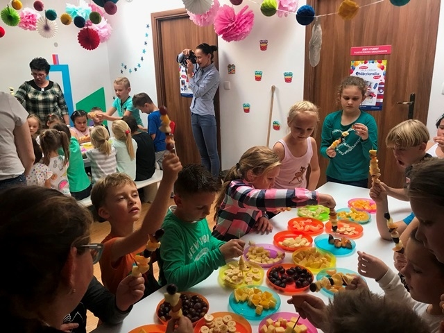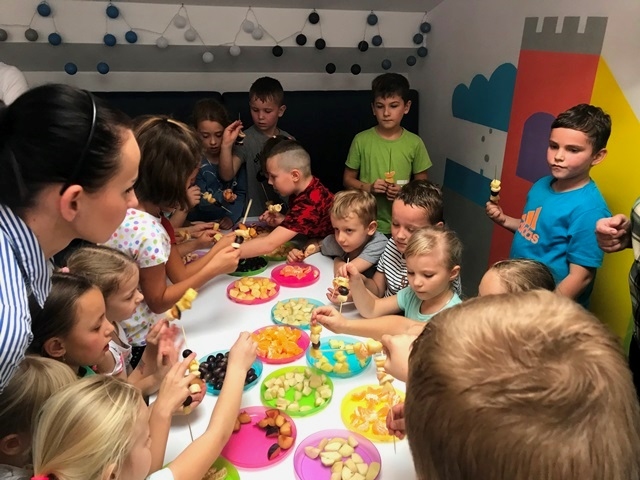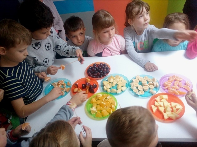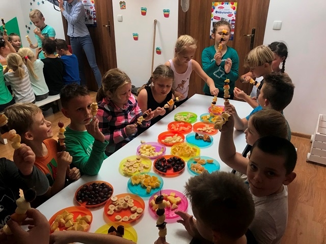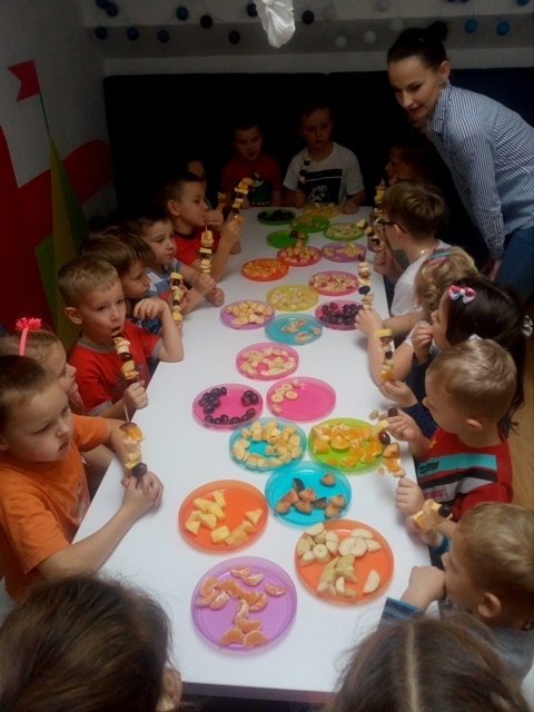 Pani przeprowadziła pogadankę pt. "Dlaczego warto jeść owoce? Jakie mają witaminy i jakie znaczenie mają one dla naszego organizmu." Dzieci przy okazji również utrwaliły nazwy owoców, opisywały jakie mogą być w smaku. Następnie Pani zrobiła pyszny zdrowy eko-sok z owoców i jarmużu. Dzieci zajadały się wykonanymi przez siebie szaszłykami i popijały zielonym sokiem. Wszyscy byli zachwyceni całą wycieczką i z pewnością chętnie tu powrócą.