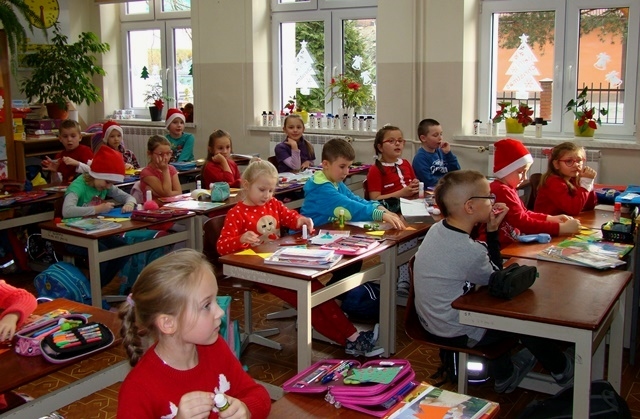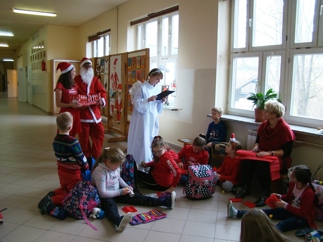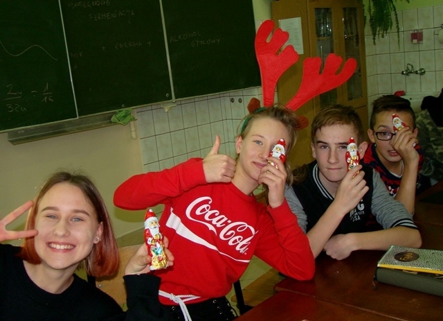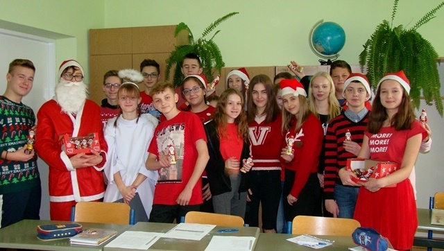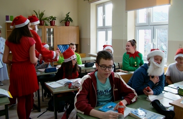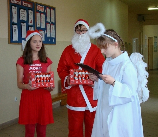 6 grudnia zawsze wszystkim dobrze się kojarzy. W naszej szkole w tym dniu każdy - czy to duży, czy to mały jest radosny i wesoły. Z niecierpliwością czeka na „Nocne Poszukiwania Mikołaja”, które co roku czekają nas wieczorem.  W tym magicznym dniu Samorząd Uczniowski od rana pomagał Mikołajowi ! Przedstawiciel SU, Szymon Nakielski z klasy 7b odwiedził wszystkie klasy, złożył mikołajkowe życzenia oraz rozdał czekoladowe upominki.  Kinga Słaby z kl. 7a i Justyna Czerpak z kl. 8a jako elfy przeczytały kilka informacji dotyczących Świętego, który pomagał biednym, chorym oraz samotnym, jak tylko umiał przez całe swoje życie. Za zgodą Pana Dyrektora Aleksandra Łukasika 6 grudnia był dniem bez mundurka w kolorach czerwonym i zielonym. Czuć, że święta już tuż tuż…