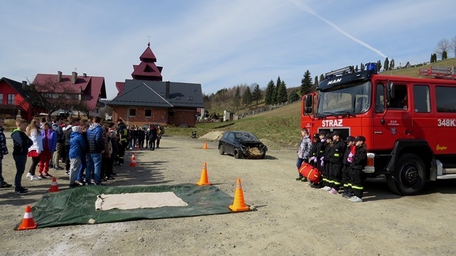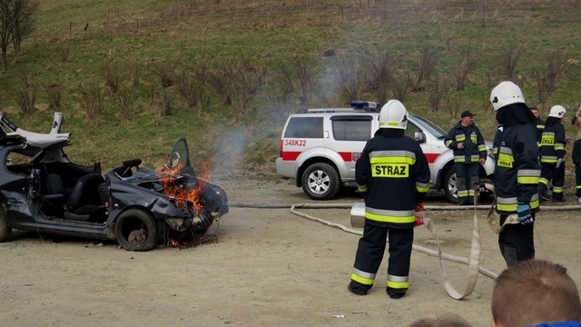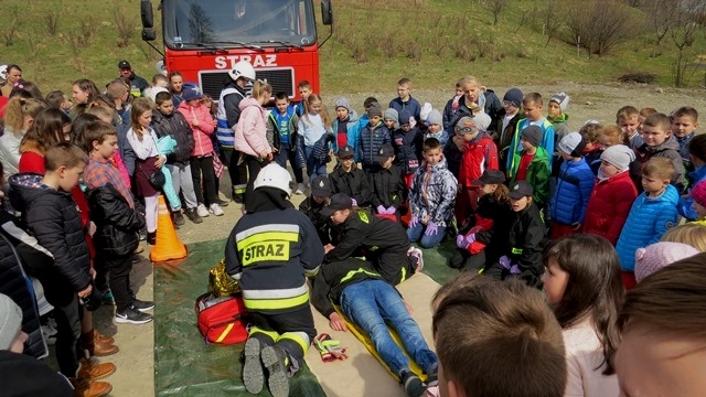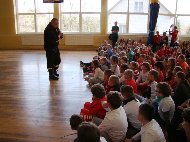 · uczestniczyli w spotkaniu ze strażakami Państwowej i Ochotniczej Straży Pożarnej, podczas którego zobaczyli jak udziela się pomocy człowiekowi poszkodowanemu w wypadku komunikacyjnym, poznali czym gasi się pożar powstały wskutek zapalenia oleju, oraz dowiedzieli się o szkodliwości i skutkach wypalania traw.