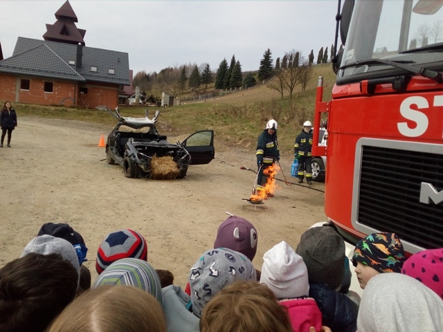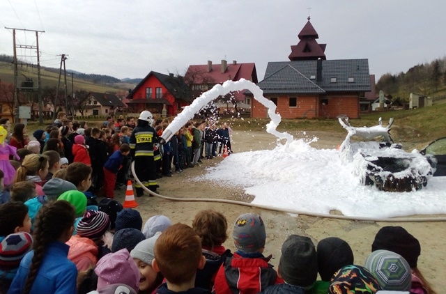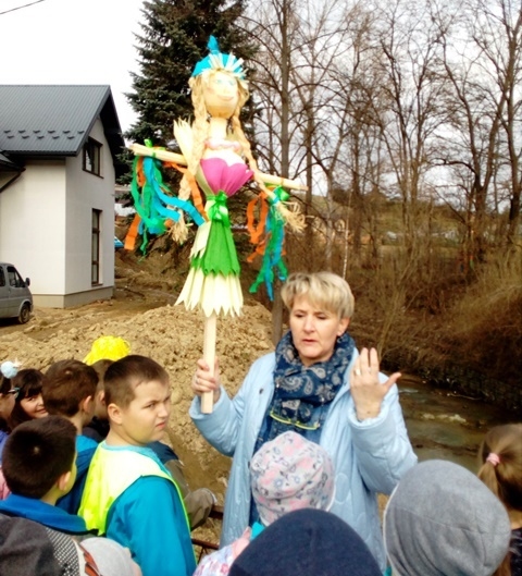 21 marca dzieci z najmłodszych klas naszej szkoły witały nową porę roku Wiosnę, zaś pożegnały Zimę. Tego dnia zaczęły od przygotowania zdrowego śniadania, przy okazji utrwalając nazwy warzyw i kolorów. Następnie na sali gimnastycznej spotkały się ze strażakiem, który przeprowadził z dziećmi pogadankę na temat numerów alarmowych, bezpieczeństwa oraz pracy, którą wykonuje strażak. Wspólnie z innymi dziećmi uczestniczyły w pokazie, podczas którego wyciągano poszkodowaną osobę z zakleszczonego samochodu, gaszono zapaloną patelnię z olejem oraz płonący samochód. Mogliśmy również zobaczyć jak udziela się pierwszej pomocy poszkodowanemu. Największą atrakcją dla dzieci było gaszenie płomieni pianą. Na koniec dzieci barwnym korowodem wspólnie z Marzanną przemaszerowały nad rzekę, aby pożegnać się z zimą.